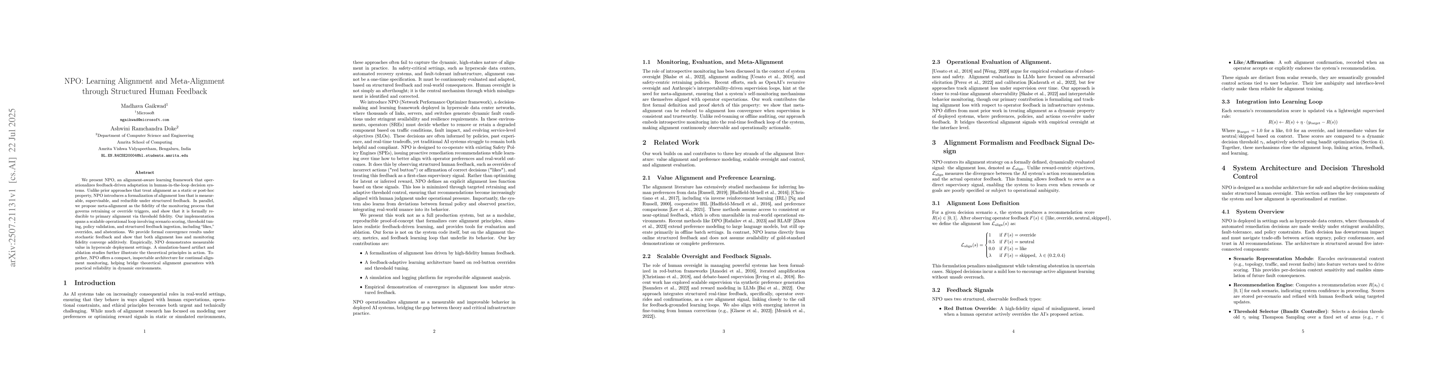 We present NPO, an alignment-aware learning framework that operationalizes feedback-driven adaptation in human-in-the-loop decision systems. Unlike prior approaches that treat alignment as a static or post-hoc property, NPO introduces a formalization of alignment loss that is measurable, supervisable, and reducible under structured feedback. In parallel, we propose meta-alignment as the fidelity of the monitoring process that governs retraining or override triggers, and show that it is formally reducible to primary alignment via threshold fidelity. Our implementation spans a scalable operational loop involving scenario scoring, threshold tuning, policy validation, and structured feedback ingestion, including "likes", overrides, and abstentions. We provide formal convergence results under stochastic feedback and show that both alignment loss and monitoring fidelity converge additively. Empirically, NPO demonstrates measurable value in hyperscale deployment settings. A simulation-based artifact and ablation studies further illustrate the theoretical principles in action. Together, NPO offers a compact, inspectable architecture for continual alignment monitoring, helping bridge theoretical alignment guarantees with practical reliability in dynamic environments.