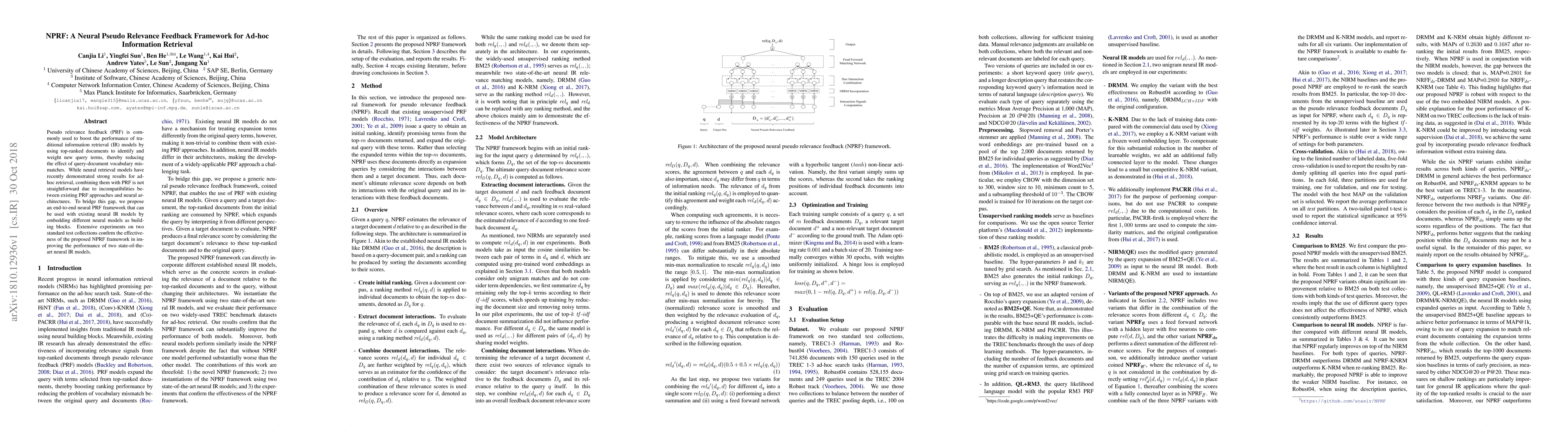 The paper proposes NPRF, a neural pseudo-relevance feedback framework to enhance the performance of neural information retrieval models by integrating PRF techniques. Experiments show NPRF effectively improves the performance of state-of-the-art neural IR models.