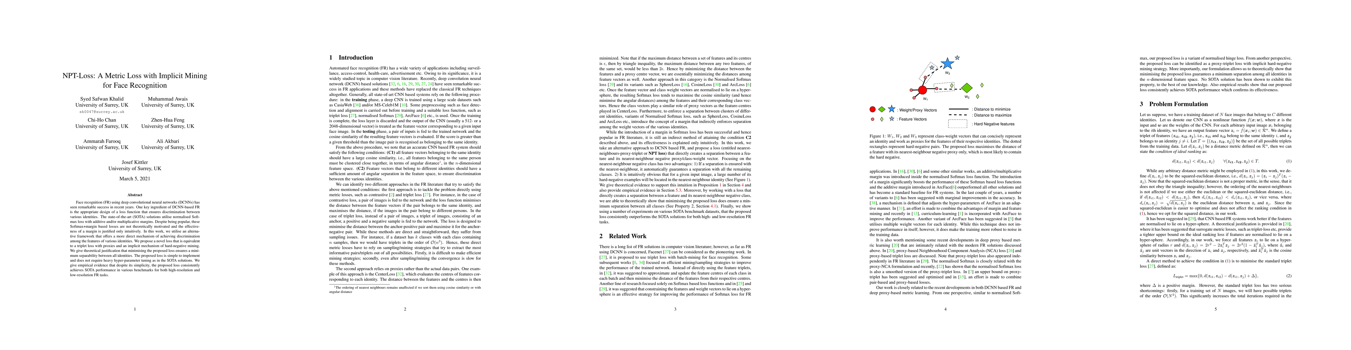 This paper proposes a novel NPT-Loss for face recognition using deep convolutional neural networks, which offers a more direct mechanism for achieving discrimination among identities compared to traditional Softmax losses. The proposed loss, equivalent to a triplet loss with implicit hard-negative mining, achieves state-of-the-art performance without requiring heavy hyperparameter tuning.