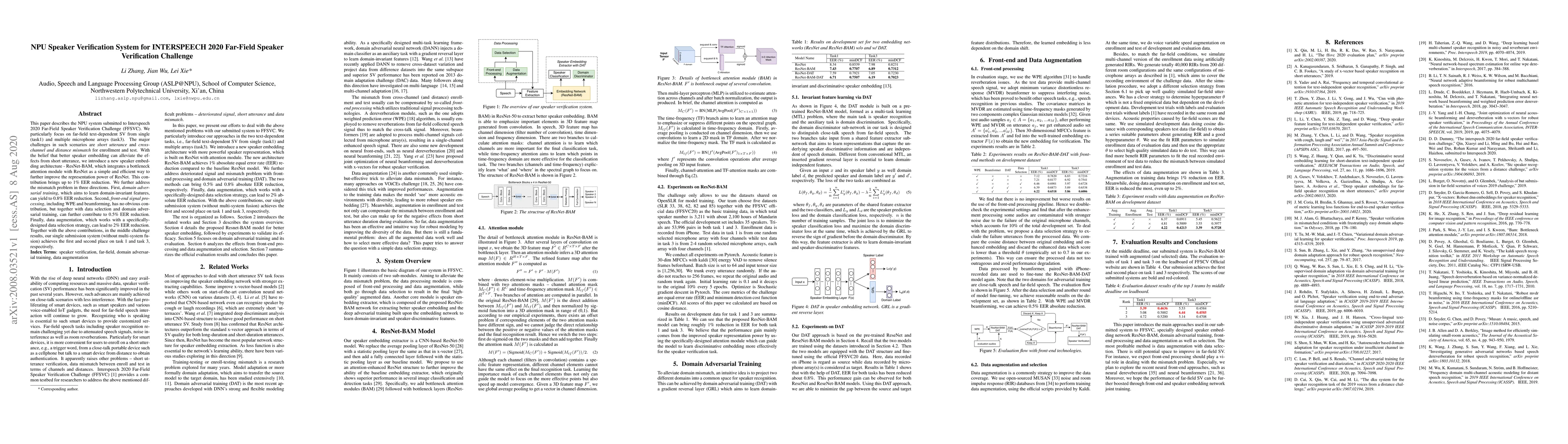 This paper presents an NPU-based speaker verification system for the INTERSPEECH 2020 Far-Field Speaker Verification Challenge, focusing on text-dependent verification from single and multiple microphone arrays. The authors introduce a ResNet-BAM architecture for improved speaker embeddings and achieve up to 1% EER reduction, alongside domain adversarial training, signal processing, and data augmentation for addressing mismatch issues. The system secured first and second place in the respective tasks.