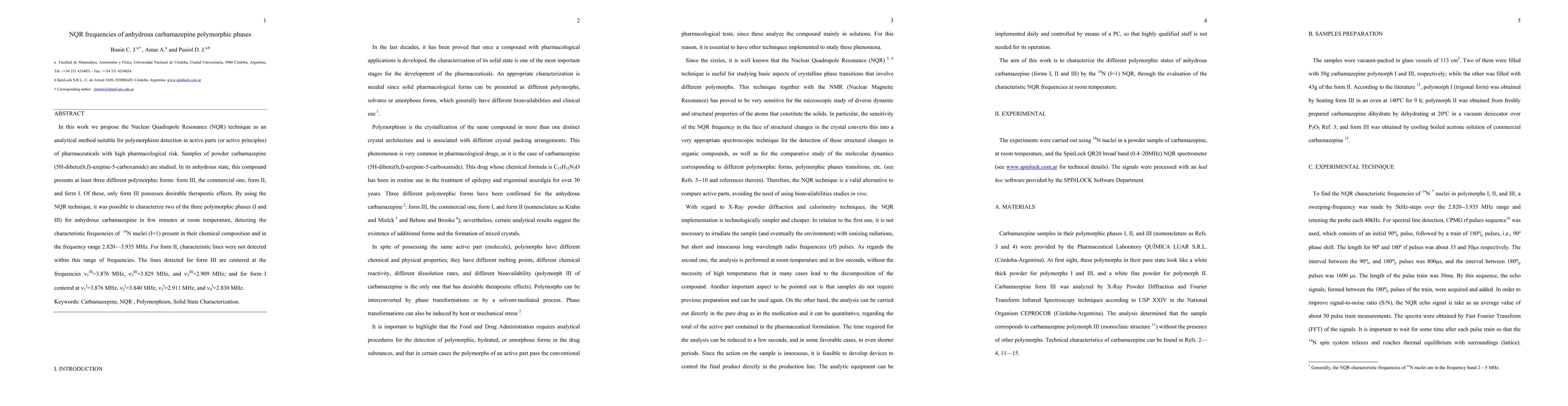 This study uses Nuclear Quadrupole Resonance (NQR) to detect and characterize polymorphic forms of anhydrous carbamazepine, identifying distinct NQR frequencies for forms I and III, but not form II. The technique efficiently distinguishes the therapeutically relevant form III from others in a few minutes.