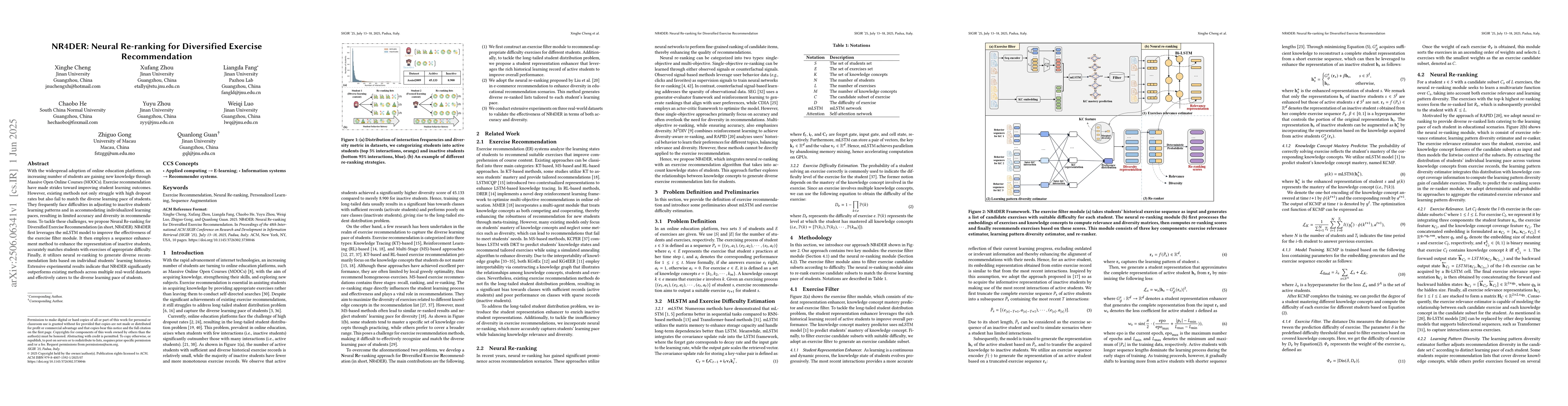 With the widespread adoption of online education platforms, an increasing number of students are gaining new knowledge through Massive Open Online Courses (MOOCs). Exercise recommendation have made strides toward improving student learning outcomes. However, existing methods not only struggle with high dropout rates but also fail to match the diverse learning pace of students. They frequently face difficulties in adjusting to inactive students' learning patterns and in accommodating individualized learning paces, resulting in limited accuracy and diversity in recommendations. To tackle these challenges, we propose Neural Re-ranking for Diversified Exercise Recommendation (in short, NR4DER). NR4DER first leverages the mLSTM model to improve the effectiveness of the exercise filter module. It then employs a sequence enhancement method to enhance the representation of inactive students, accurately matches students with exercises of appropriate difficulty. Finally, it utilizes neural re-ranking to generate diverse recommendation lists based on individual students' learning histories. Extensive experimental results indicate that NR4DER significantly outperforms existing methods across multiple real-world datasets and effectively caters to the diverse learning pace of students.