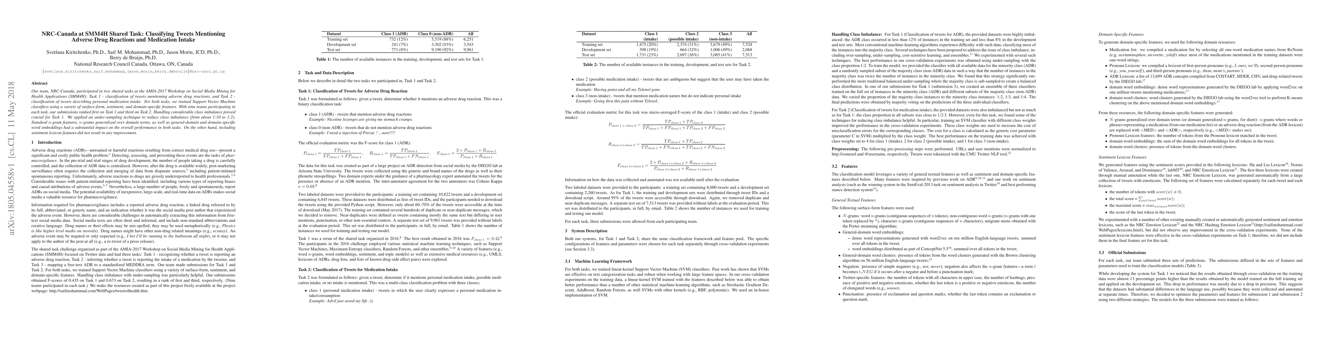 NRC-Canada's team ranked first in classifying tweets mentioning adverse drug reactions and third in classifying tweets about personal medication intake at the SMM4H shared task. They used SVM classifiers with various features, achieving success through under-sampling for class imbalance and effective n-gram and word embedding techniques.