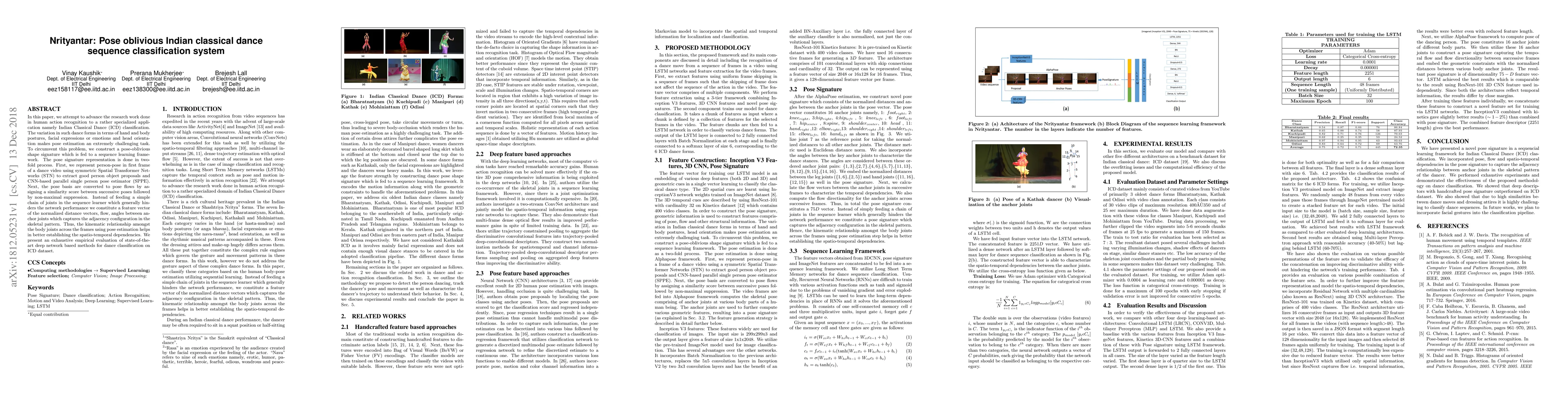 In this paper, we attempt to advance the research work done in human action recognition to a rather specialized application namely Indian Classical Dance (ICD) classification. The variation in such dance forms in terms of hand and body postures, facial expressions or emotions and head orientation makes pose estimation an extremely challenging task. To circumvent this problem, we construct a pose-oblivious shape signature which is fed to a sequence learning framework. The pose signature representation is done in two-fold process. First, we represent person-pose in first frame of a dance video using symmetric Spatial Transformer Networks (STN) to extract good person object proposals and CNN-based parallel single person pose estimator (SPPE). Next, the pose basis are converted to pose flows by assigning a similarity score between successive poses followed by non-maximal suppression. Instead of feeding a simple chain of joints in the sequence learner which generally hinders the network performance we constitute a feature vector of the normalized distance vectors, flow, angles between anchor joints which captures the adjacency configuration in the skeletal pattern. Thus, the kinematic relationship amongst the body joints across the frames using pose estimation helps in better establishing the spatio-temporal dependencies. We present an exhaustive empirical evaluation of state-of-the-art deep network based methods for dance classification on ICD dataset.