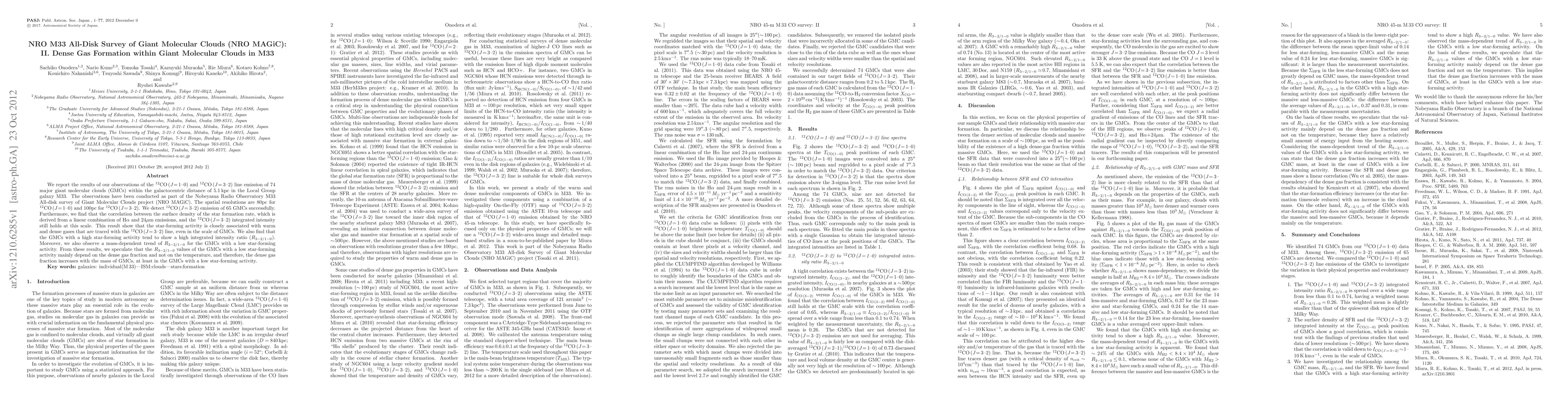 This study observes 74 giant molecular clouds (GMCs) in M33 using 12CO lines, revealing a strong correlation between star formation and dense gas traced by 12CO (J=3-2). The findings suggest that high star-forming GMCs exhibit a higher integrated intensity ratio (R3-2/1-0), indicating a mass-dependent dense gas fraction in low star-forming GMCs.