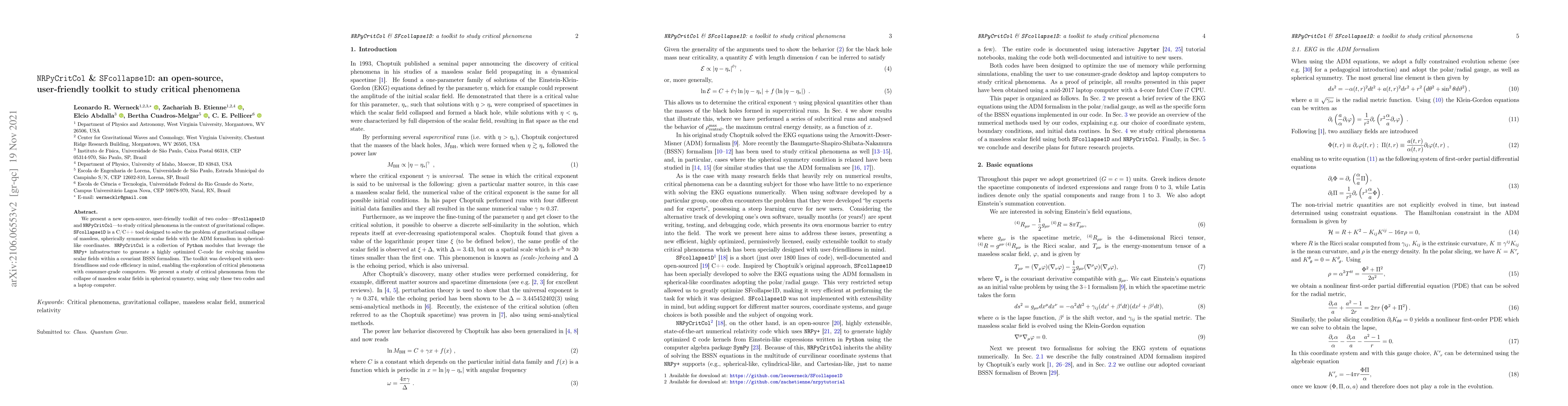 This paper introduces an open-source toolkit, consisting of SFcollapse1D and NRPyCritCol, for studying critical phenomena in gravitational collapse. SFcollapse1D solves spherically symmetric scalar field collapse using the ADM formalism, while NRPyCritCol generates optimized C-code for massless scalar fields in BSSN formalism, enabling efficient exploration of critical phenomena on standard computers.