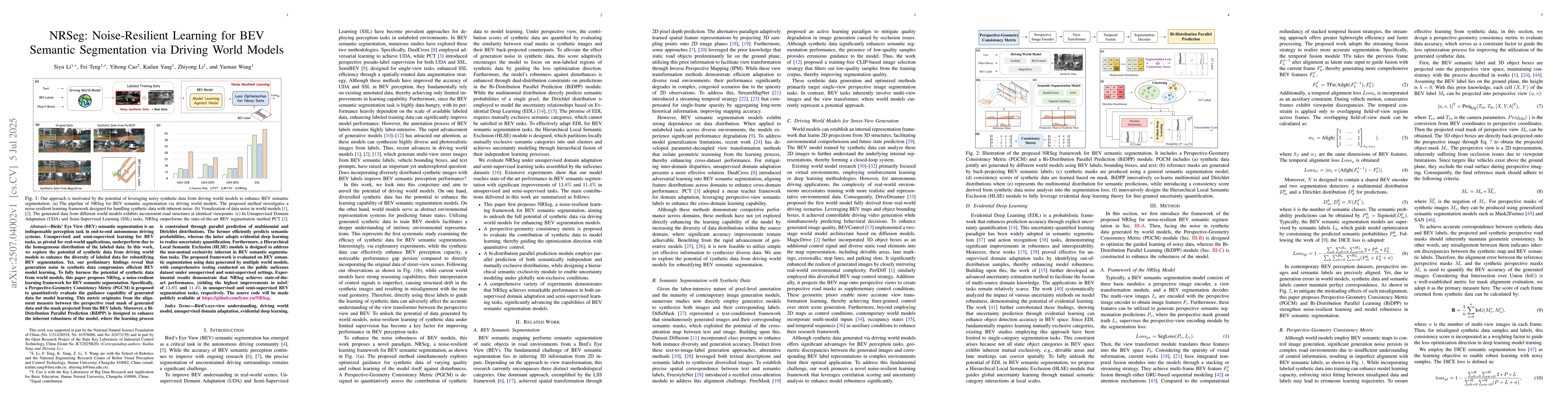 Birds' Eye View (BEV) semantic segmentation is an indispensable perception task in end-to-end autonomous driving systems. Unsupervised and semi-supervised learning for BEV tasks, as pivotal for real-world applications, underperform due to the homogeneous distribution of the labeled data. In this work, we explore the potential of synthetic data from driving world models to enhance the diversity of labeled data for robustifying BEV segmentation. Yet, our preliminary findings reveal that generation noise in synthetic data compromises efficient BEV model learning. To fully harness the potential of synthetic data from world models, this paper proposes NRSeg, a noise-resilient learning framework for BEV semantic segmentation. Specifically, a Perspective-Geometry Consistency Metric (PGCM) is proposed to quantitatively evaluate the guidance capability of generated data for model learning. This metric originates from the alignment measure between the perspective road mask of generated data and the mask projected from the BEV labels. Moreover, a Bi-Distribution Parallel Prediction (BiDPP) is designed to enhance the inherent robustness of the model, where the learning process is constrained through parallel prediction of multinomial and Dirichlet distributions. The former efficiently predicts semantic probabilities, whereas the latter adopts evidential deep learning to realize uncertainty quantification. Furthermore, a Hierarchical Local Semantic Exclusion (HLSE) module is designed to address the non-mutual exclusivity inherent in BEV semantic segmentation tasks. Experimental results demonstrate that NRSeg achieves state-of-the-art performance, yielding the highest improvements in mIoU of 13.8% and 11.4% in unsupervised and semi-supervised BEV segmentation tasks, respectively. The source code will be made publicly available at https://github.com/lynn-yu/NRSeg.