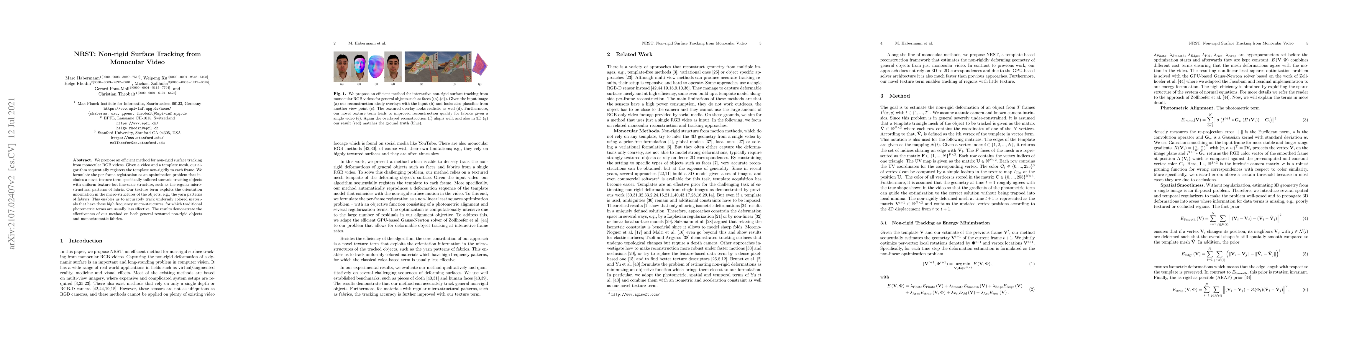 This research introduces NRST, a method for tracking non-rigid surfaces in monocular RGB videos. It uses a novel texture term to accurately register uniformly colored materials with fine-scale structures, like fabric patterns, surpassing traditional photometric terms in effectiveness.