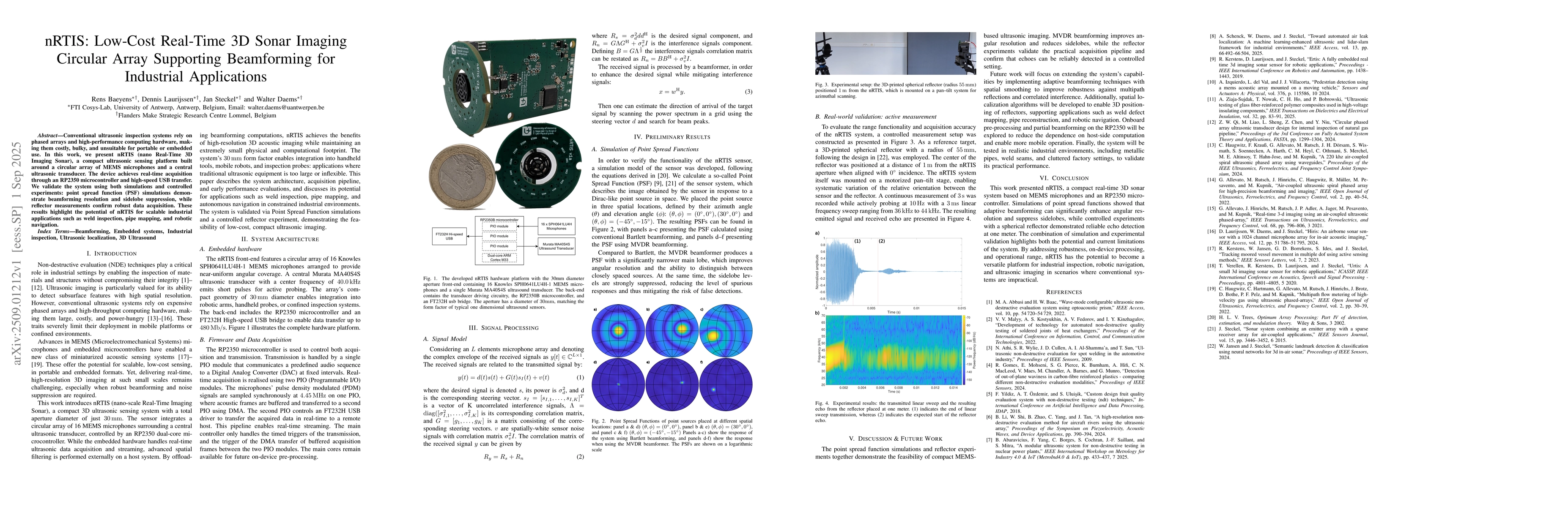 Conventional ultrasonic inspection systems rely on phased arrays and high-performance computing hardware, making them costly, bulky, and unsuitable for portable or embedded use. In this work, we present nRTIS (nano Real-Time 3D Imaging Sonar), a compact ultrasonic sensing platform built around a circular array of MEMS microphones and a central ultrasonic transducer. The device achieves real-time acquisition through an RP2350 microcontroller and high-speed USB transfer. We validate the system using both simulations and controlled experiments: point spread function (PSF) simulations demonstrate beamforming resolution and sidelobe suppression, while reflector measurements confirm robust data acquisition. These results highlight the potential of nRTIS for scalable industrial applications such as weld inspection, pipe mapping, and robotic navigation.
