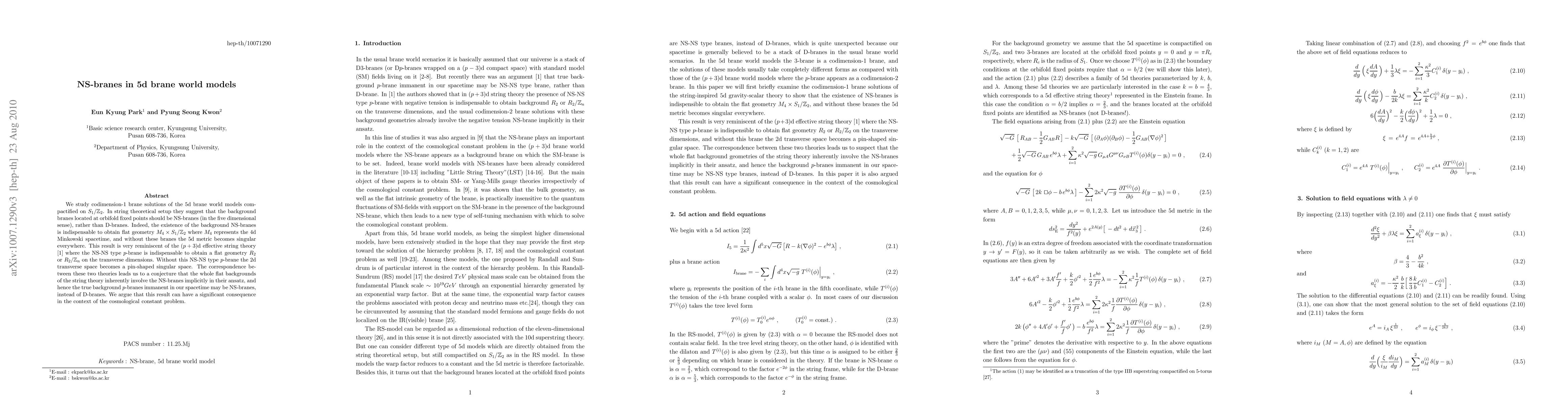 This paper investigates codimension-1 brane solutions in 5d brane world models compactified on $S_1 / \mathbb{Z}_2$, concluding that NS-branes are essential for obtaining flat geometry $M_4 \times S_1 / \mathbb{Z}_2$. The study suggests that NS-branes, rather than D-branes, are indispensable in the background, potentially resolving the cosmological constant problem.