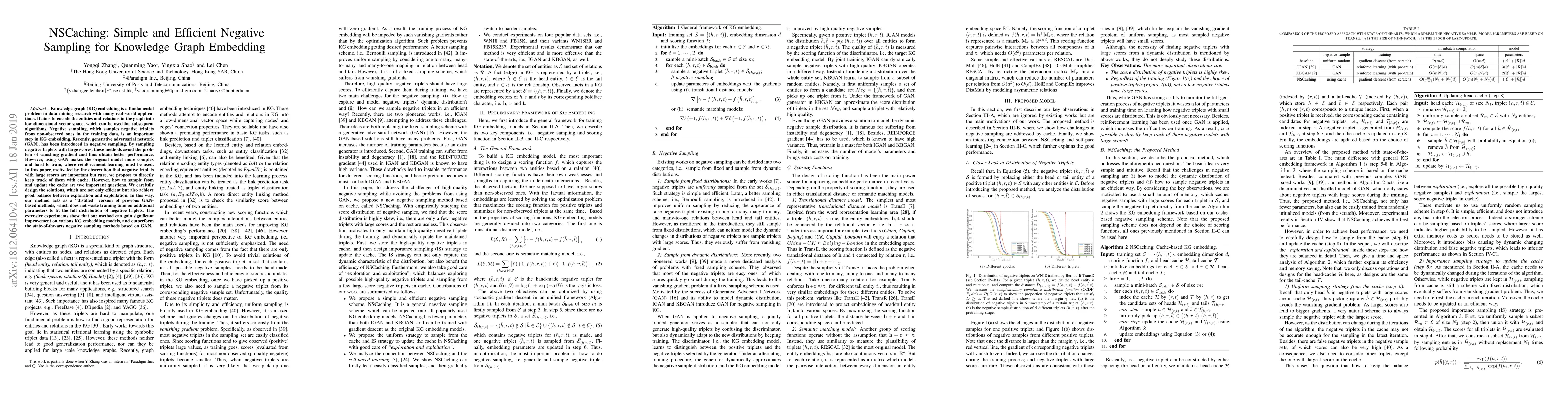 The paper introduces NSCaching, a simple and efficient negative sampling method for Knowledge Graph embedding, which maintains a cache of important but rare negative triplets to improve training efficiency. This approach balances exploration and exploitation without the complexity of generative adversarial networks, achieving superior performance over state-of-the-art GAN-based methods.