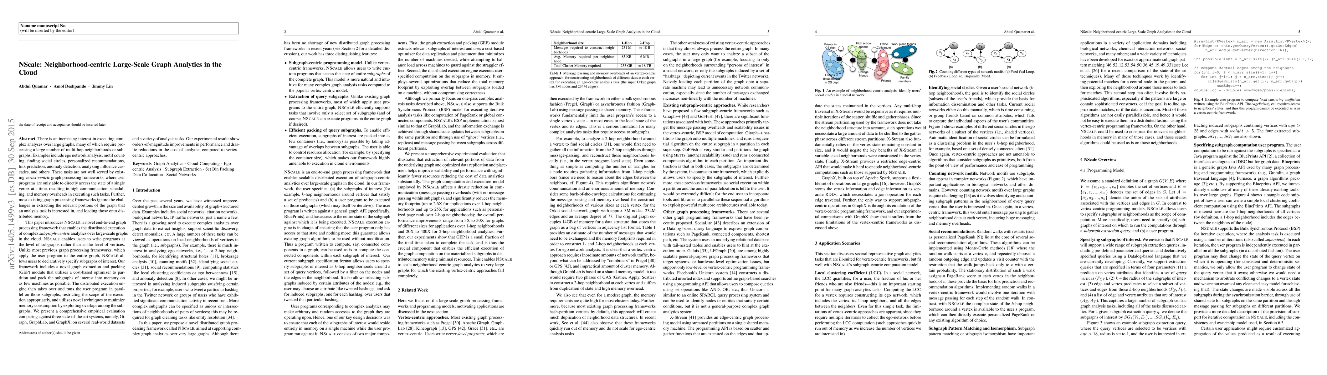 NScale introduces a novel framework for large-scale graph analytics in the cloud, enabling distributed execution of subgraph-centric tasks by specifying subgraphs of interest rather than individual vertices. The GEP module optimizes subgraph extraction and packing for efficient processing, resulting in significant performance and cost improvements over traditional vertex-centric methods.