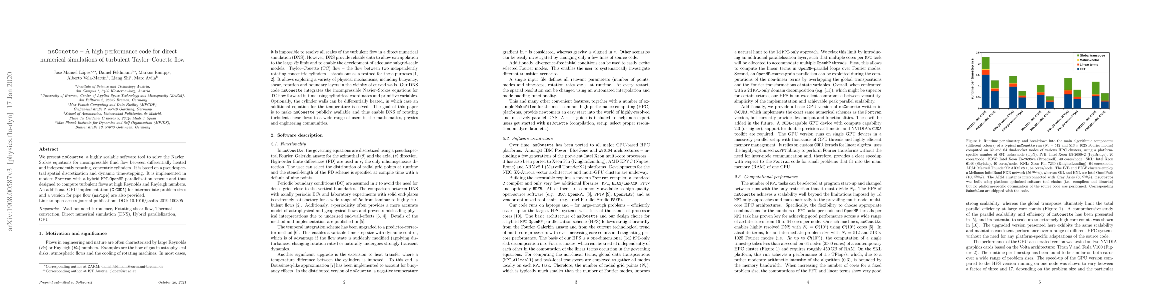 nsCouette is a scalable software tool for solving Navier-Stokes equations in turbulent Taylor-Couette flow using pseudospectral discretization and hybrid MPI-OpenMP parallelization. It also offers GPU implementation for intermediate problem sizes and a version for turbulent pipe flow.