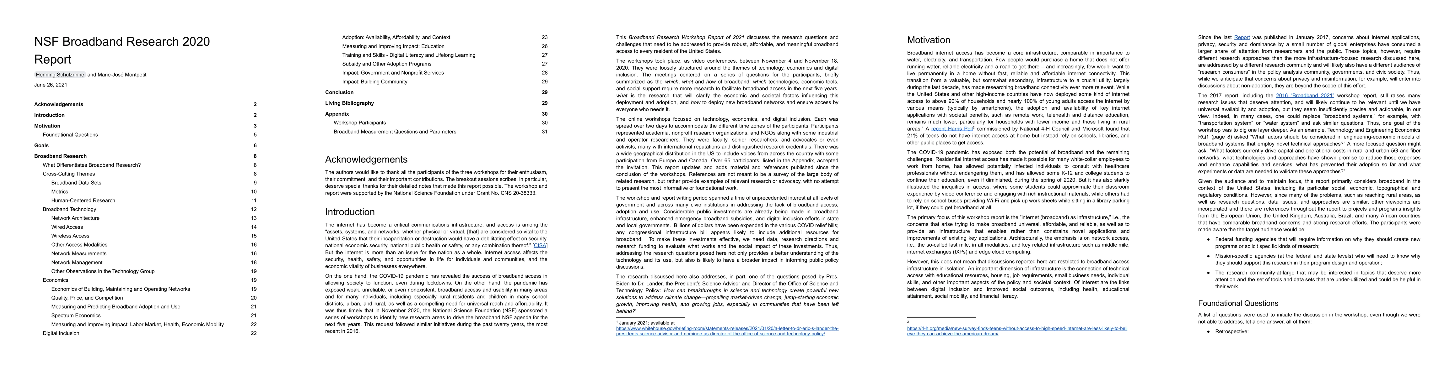 The internet has become a critical communications infrastructure, and access is among the ``assets, systems, and networks, whether physical or virtual, [that] are considered so vital to the United States that their incapacitation or destruction would have a debilitating effect on security, national economic security, national public health or safety, or any combination thereof.'' [CISA] But the internet is more than an issue for the nation as a whole. Internet access affects the security, health, safety, and opportunities in life for individuals and communities, and the economic vitality of businesses everywhere. On the one hand, the COVID-19 pandemic has revealed the success of broadband access in allowing society to function, even during lockdowns. On the other hand, the pandemic has exposed weak, unreliable, or even nonexistent, broadband access and usability in many areas and for many individuals, including especially rural residents and children in many school districts, urban, and rural, as well as a compelling need for universal reach and affordability. It was thus timely that in November 2020, the National Science Foundation (NSF) sponsored a series of workshops to identify new research areas to drive the broadband NSF agenda for the next five years. This request followed similar initiatives during the past twenty years, the most recent in 2016. This Broadband Research Workshop Report of 2021 discusses the research questions and challenges that need to be addressed to provide robust, affordable, and meaningful broadband access to every resident of the United States.