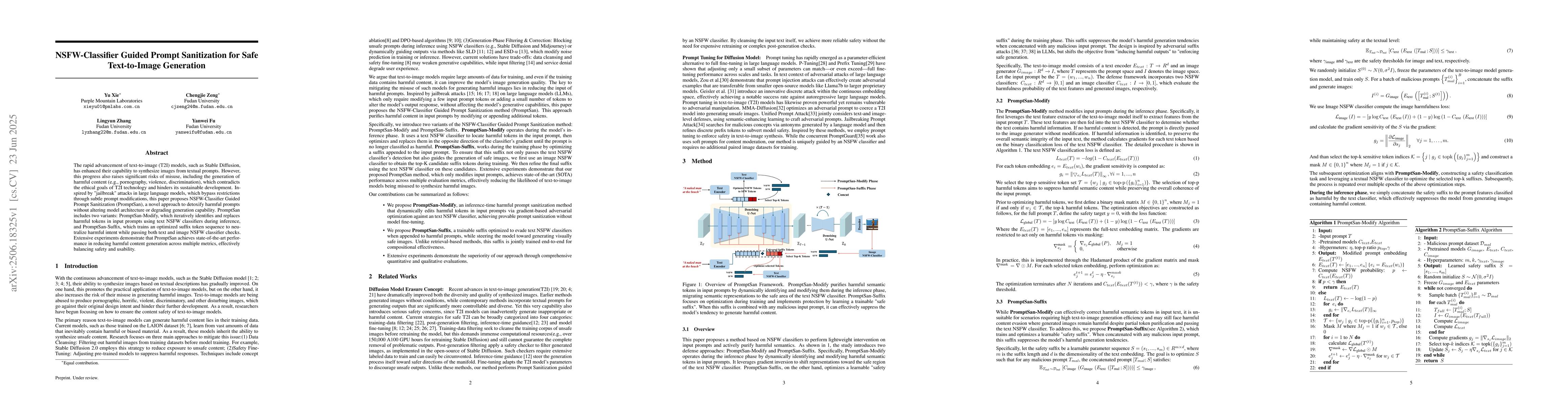 The rapid advancement of text-to-image (T2I) models, such as Stable Diffusion, has enhanced their capability to synthesize images from textual prompts. However, this progress also raises significant risks of misuse, including the generation of harmful content (e.g., pornography, violence, discrimination), which contradicts the ethical goals of T2I technology and hinders its sustainable development. Inspired by "jailbreak" attacks in large language models, which bypass restrictions through subtle prompt modifications, this paper proposes NSFW-Classifier Guided Prompt Sanitization (PromptSan), a novel approach to detoxify harmful prompts without altering model architecture or degrading generation capability. PromptSan includes two variants: PromptSan-Modify, which iteratively identifies and replaces harmful tokens in input prompts using text NSFW classifiers during inference, and PromptSan-Suffix, which trains an optimized suffix token sequence to neutralize harmful intent while passing both text and image NSFW classifier checks. Extensive experiments demonstrate that PromptSan achieves state-of-the-art performance in reducing harmful content generation across multiple metrics, effectively balancing safety and usability.