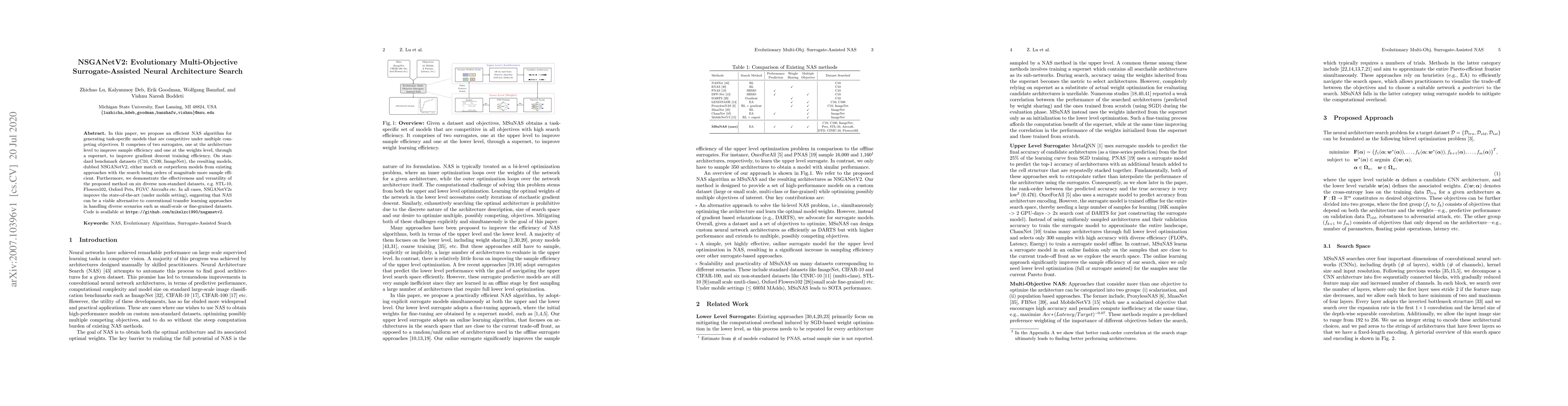 In this paper, we propose an efficient NAS algorithm for generating task-specific models that are competitive under multiple competing objectives. It comprises of two surrogates, one at the architecture level to improve sample efficiency and one at the weights level, through a supernet, to improve gradient descent training efficiency. On standard benchmark datasets (C10, C100, ImageNet), the resulting models, dubbed NSGANetV2, either match or outperform models from existing approaches with the search being orders of magnitude more sample efficient. Furthermore, we demonstrate the effectiveness and versatility of the proposed method on six diverse non-standard datasets, e.g. STL-10, Flowers102, Oxford Pets, FGVC Aircrafts etc. In all cases, NSGANetV2s improve the state-of-the-art (under mobile setting), suggesting that NAS can be a viable alternative to conventional transfer learning approaches in handling diverse scenarios such as small-scale or fine-grained datasets. Code is available at https://github.com/mikelzc1990/nsganetv2