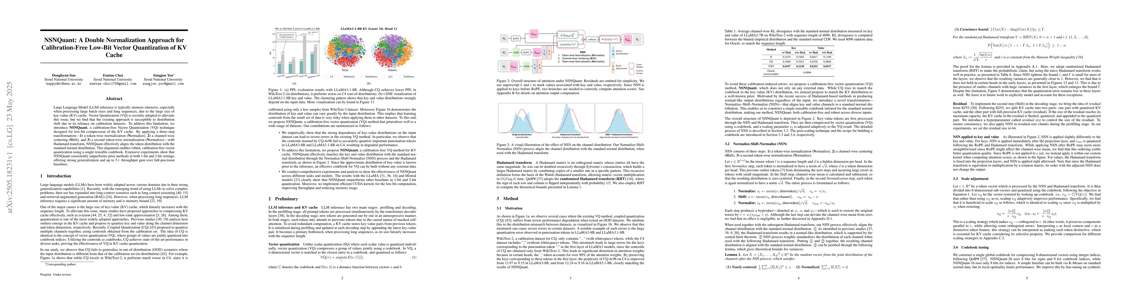 The research introduces NSNQuant, a calibration-free Vector Quantization (VQ) technique for low-bit compression of KV cache, employing a three-step transformation involving token-wise normalization, channel-wise centering, and a second token-wise normalization with Hadamard transform.