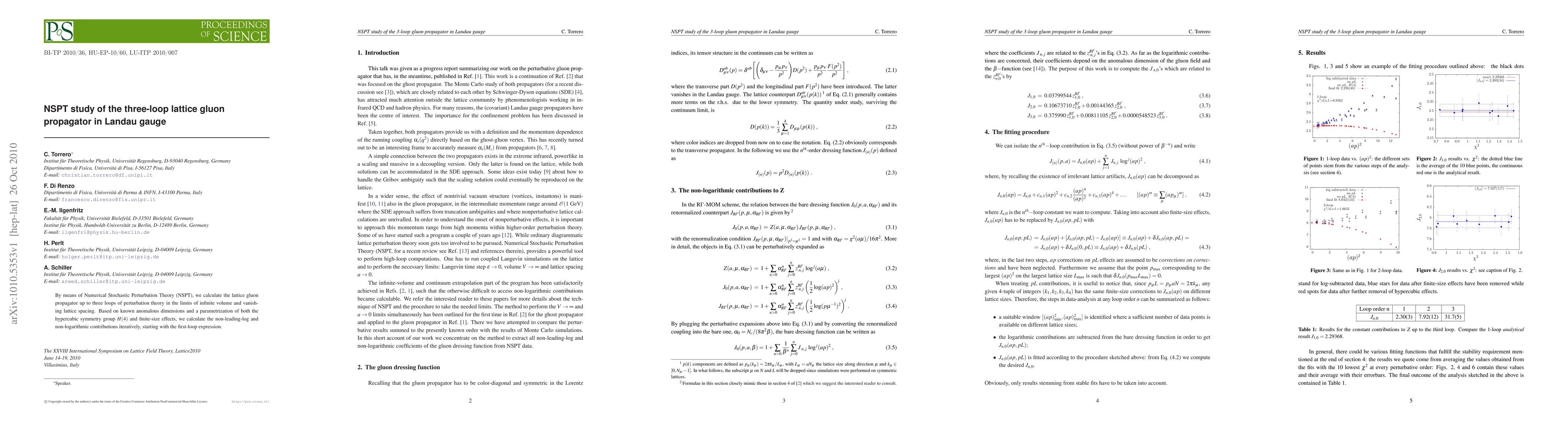 This study employs Numerical Stochastic Perturbation Theory (NSPT) to calculate the three-loop lattice gluon propagator in Landau gauge, focusing on infinite volume and zero lattice spacing. The research iteratively computes non-leading-log and non-logarithmic contributions, starting from the first-loop expression.