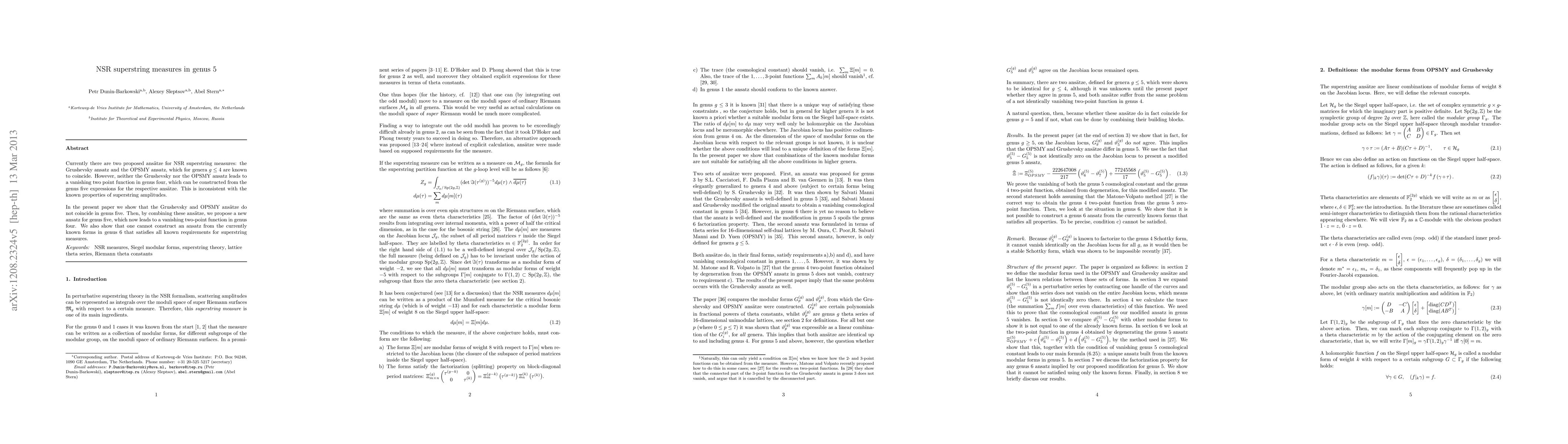 Currently there are two proposed ansatze for NSR superstring measures: the Grushevsky ansatz and the OPSMY ansatz, which for genera g<=4 are known to coincide. However, neither the Grushevsky nor the OPSMY ansatz leads to a vanishing two point function in genus four, which can be constructed from the genus five expressions for the respective ansatze. This is inconsistent with the known properties of superstring amplitudes. In the present paper we show that the Grushevsky and OPSMY ansatze do not coincide in genus five. Then, by combining these ansatze, we propose a new ansatz for genus five, which now leads to a vanishing two-point function in genus four. We also show that one cannot construct an ansatz from the currently known forms in genus 6 that satisfies all known requirements for superstring measures.