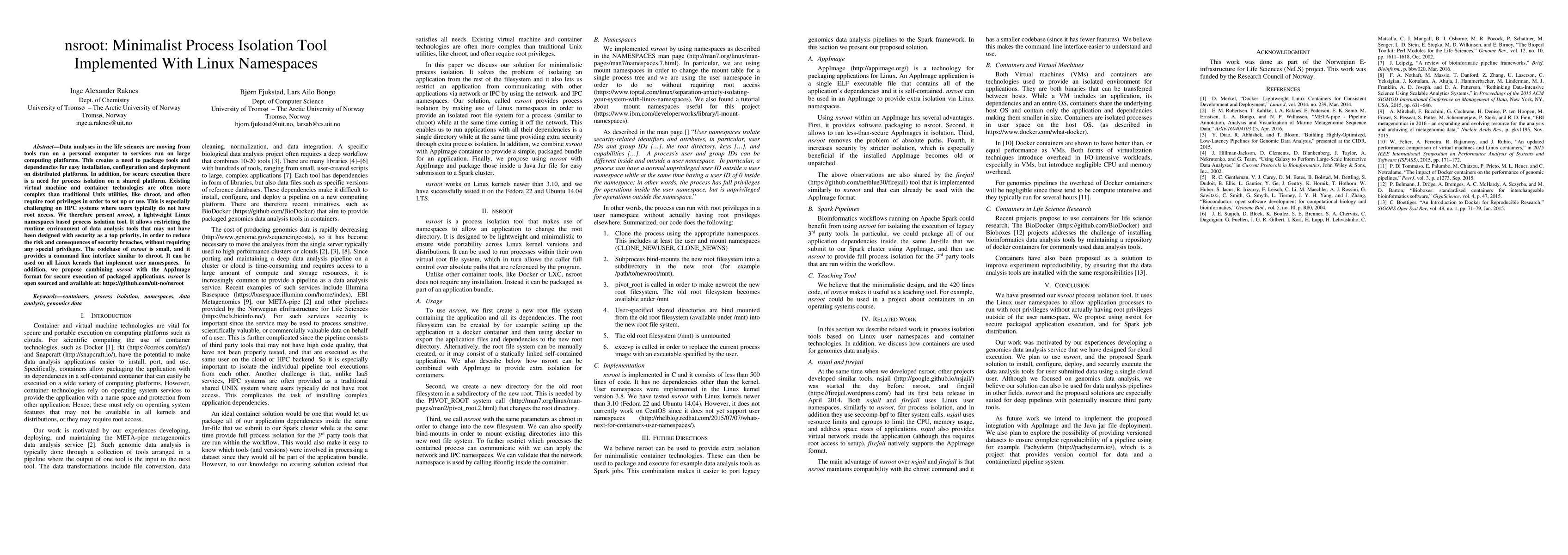 Data analyses in the life sciences are moving from tools run on a personal computer to services run on large computing platforms. This creates a need to package tools and dependencies for easy installation, configuration and deployment on distributed platforms. In addition, for secure execution there is a need for process isolation on a shared platform. Existing virtual machine and container technologies are often more complex than traditional Unix utilities, like chroot, and often require root privileges in order to set up or use. This is especially challenging on HPC systems where users typically do not have root access. We therefore present nsroot, a lightweight Linux namespaces based process isolation tool. It allows restricting the runtime environment of data analysis tools that may not have been designed with security as a top priority, in order to reduce the risk and consequences of security breaches, without requiring any special privileges. The codebase of nsroot is small, and it provides a command line interface similar to chroot. It can be used on all Linux kernels that implement user namespaces. In addition, we propose combining nsroot with the AppImage format for secure execution of packaged applications. nsroot is open sourced and available at: https://github.com/uit-no/nsroot