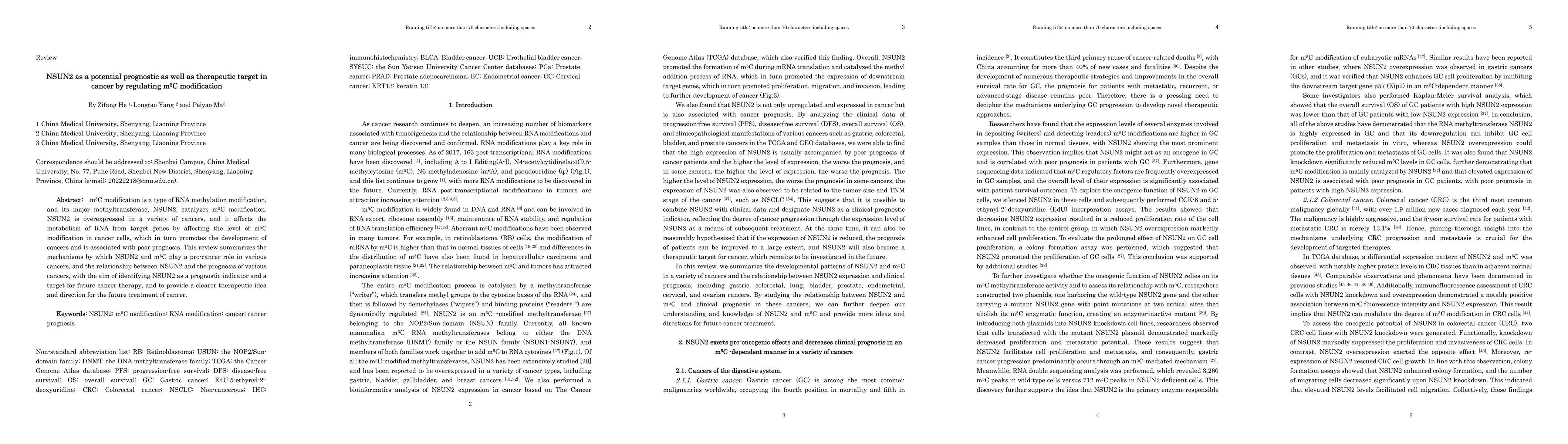 NSUN2 is overexpressed in various cancers, promoting cancer development and poor prognosis through m5C RNA modification. It may serve as a potential prognostic indicator and therapeutic target for future cancer treatment.