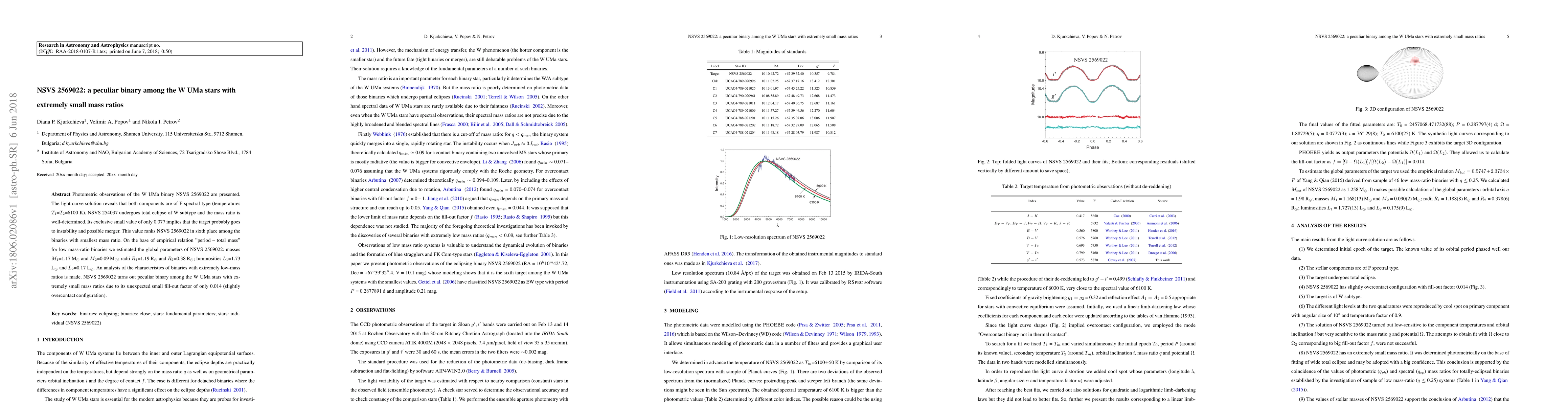 A binary star system, NSVS 2569022, has extremely small mass ratio of 0.077, indicating possible merger or instability. Its unique characteristics make it a peculiar binary among W UMa stars.