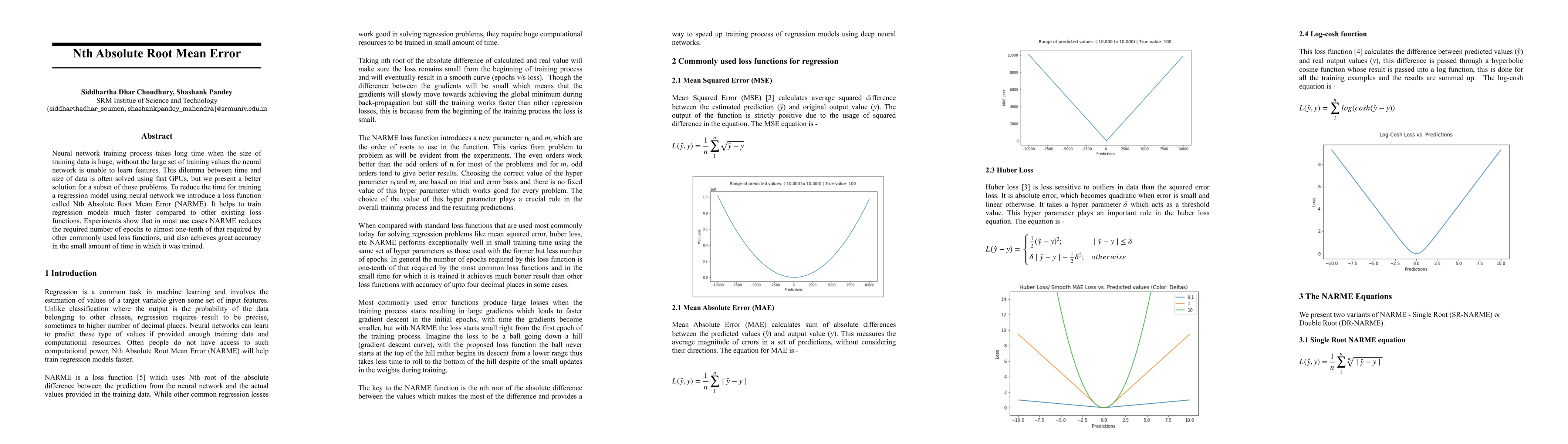 Neural network training process takes long time when the size of training data is huge, without the large set of training values the neural network is unable to learn features. This dilemma between time and size of data is often solved using fast GPUs, but we present a better solution for a subset of those problems. To reduce the time for training a regression model using neural network we introduce a loss function called Nth Absolute Root Mean Error (NARME). It helps to train regression models much faster compared to other existing loss functions. Experiments show that in most use cases NARME reduces the required number of epochs to almost one-tenth of that required by other commonly used loss functions, and also achieves great accuracy in the small amount of time in which it was trained.