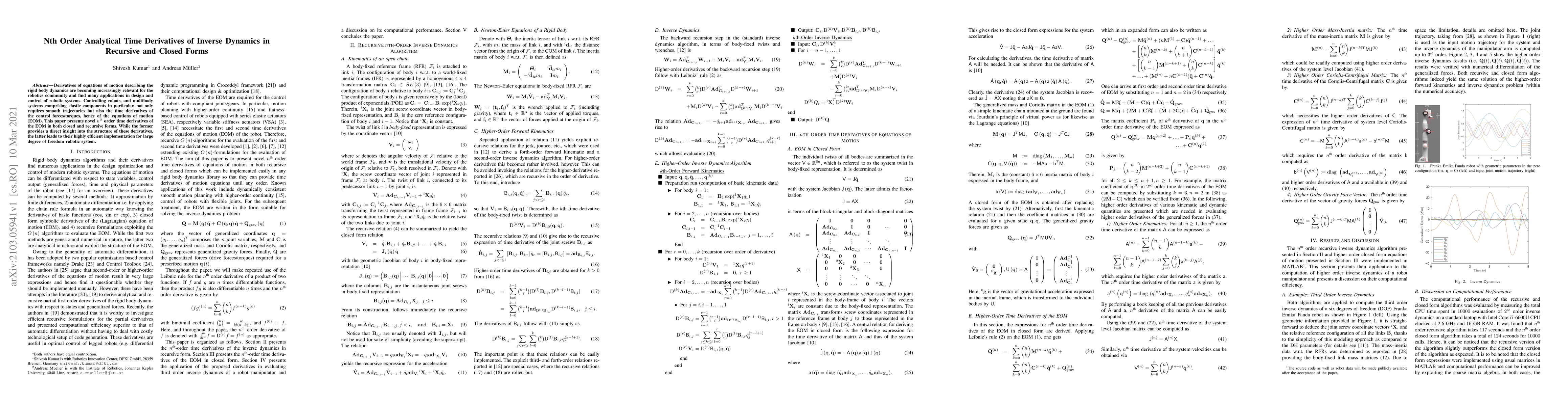 This paper presents novel nth order time derivatives of equations of motion for robotic systems in both closed and recursive forms, enabling efficient implementation for large degrees of freedom systems.