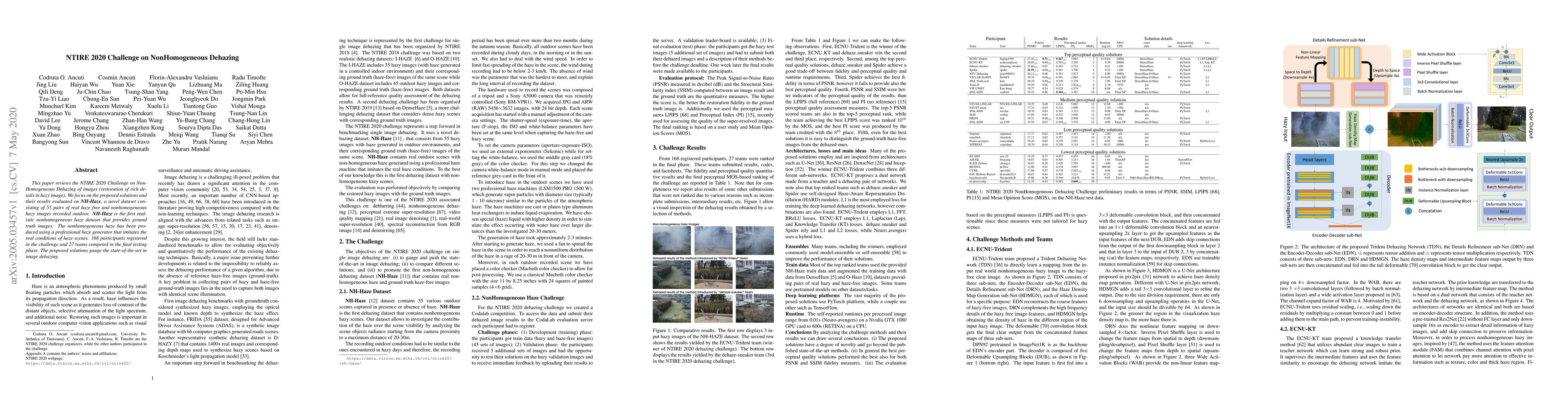 Summary: This paper reviews the NTIRE 2020 Challenge on NonHomogeneous Dehazing, focusing on solutions for restoring rich details in hazy images. The challenge utilized the novel NH-Haze dataset, featuring real pairs of haze-free and nonhomogeneous hazy outdoor images, providing ground truth and attracting 168 participants and 27 competing teams.