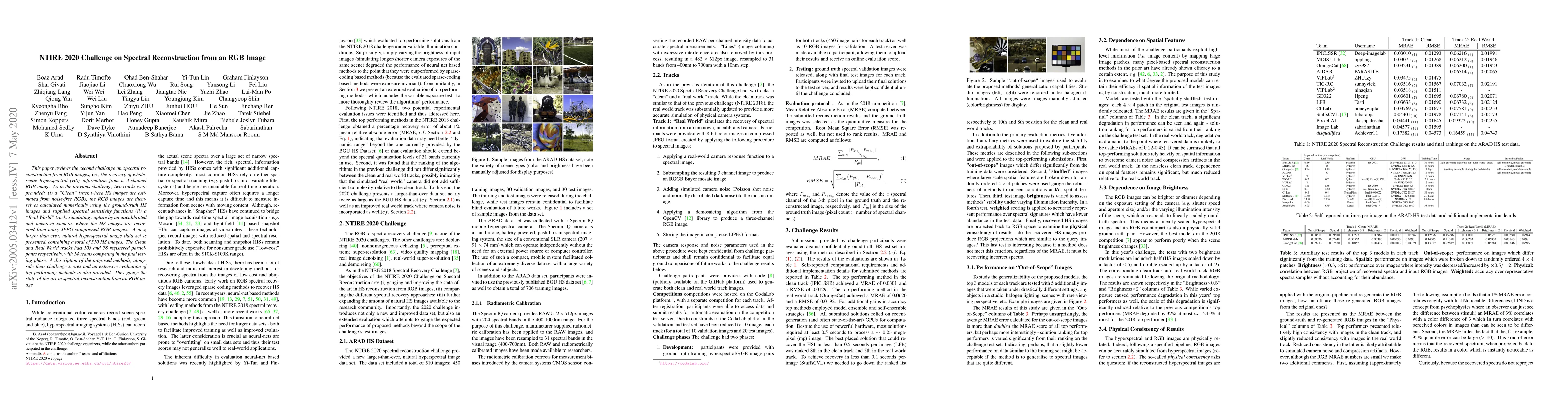 The NTIRE 2020 challenge focused on spectral reconstruction from RGB images, presenting a larger dataset of 510 hyperspectral images for two tracks: 'Clean' (noise-free RGB to HS) and 'Real World' (noisy JPEG-compressed RGB to HS). The challenge attracted 103 and 78 participants respectively, with 14 teams in the final phase. The paper evaluates and describes top-performing methods, establishing the current state-of-the-art in spectral reconstruction from RGB images.