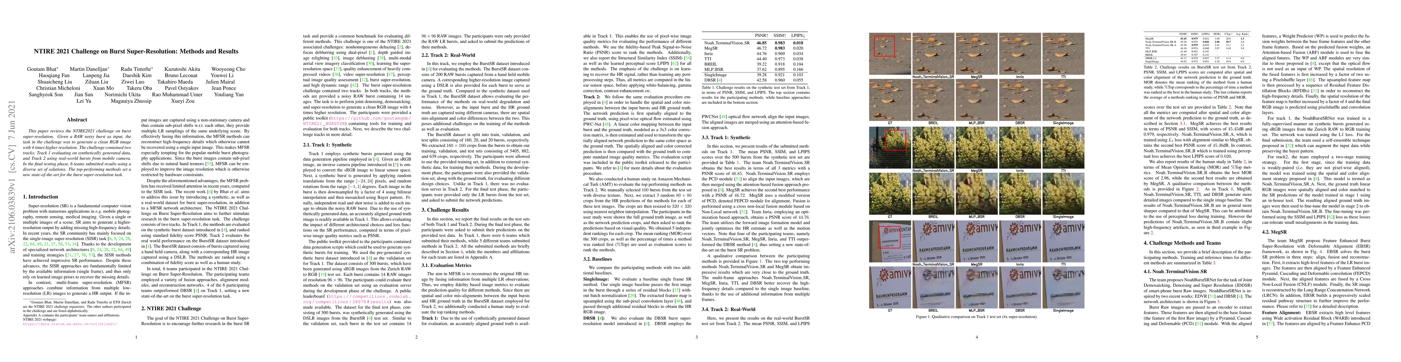 The NTIRE 2021 Challenge on Burst Super-Resolution aimed to enhance the resolution and clean noisy RAW bursts to generate high-resolution RGB images. The competition featured two tracks, one with synthetic data and another with real-world mobile camera bursts, culminating in state-of-the-art results from six participating teams.