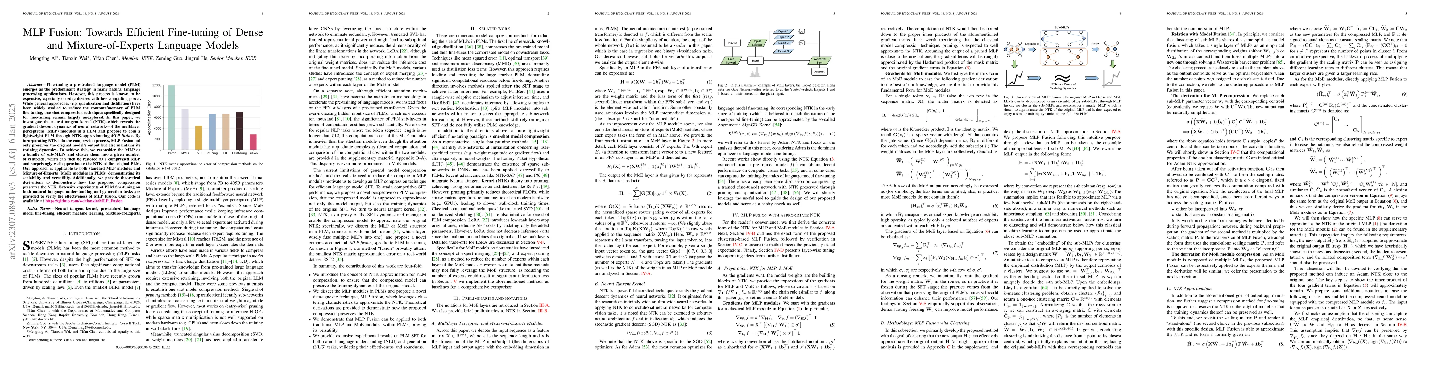 This paper proposes an NTK-approximating MLP fusion technique for efficient fine-tuning of pre-trained language models. By clustering MLP sub-modules into centroids, the method creates a compressed MLP that approximates the original model's neural tangent kernel, significantly reducing computational costs.