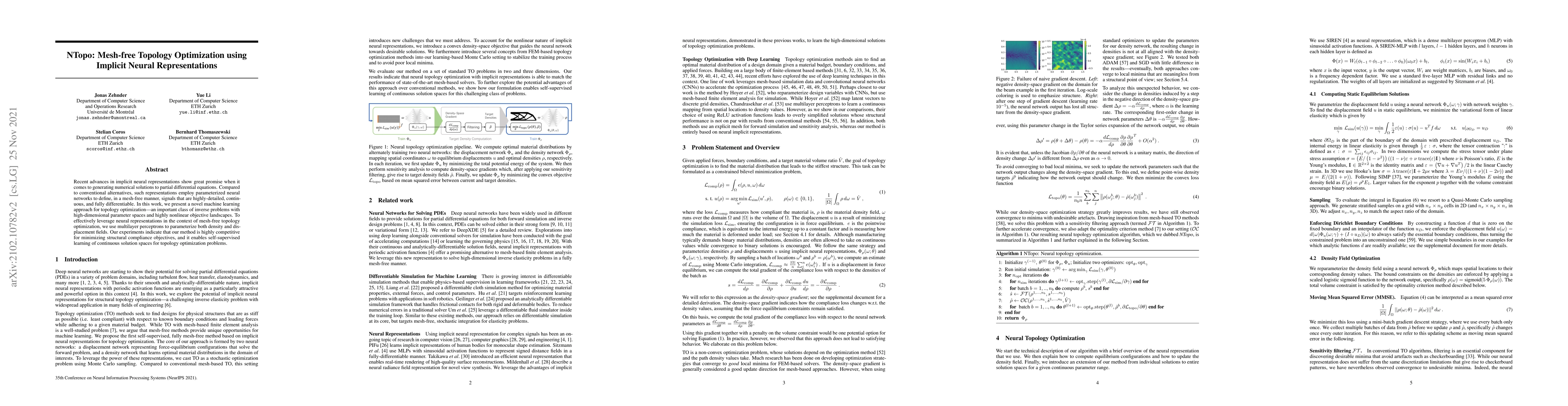 This paper introduces NTopo, a mesh-free topology optimization method using implicit neural representations. It employs multilayer perceptrons to parameterize density and displacement fields, demonstrating competitive performance in minimizing structural compliance and enabling self-supervised learning for topology optimization.