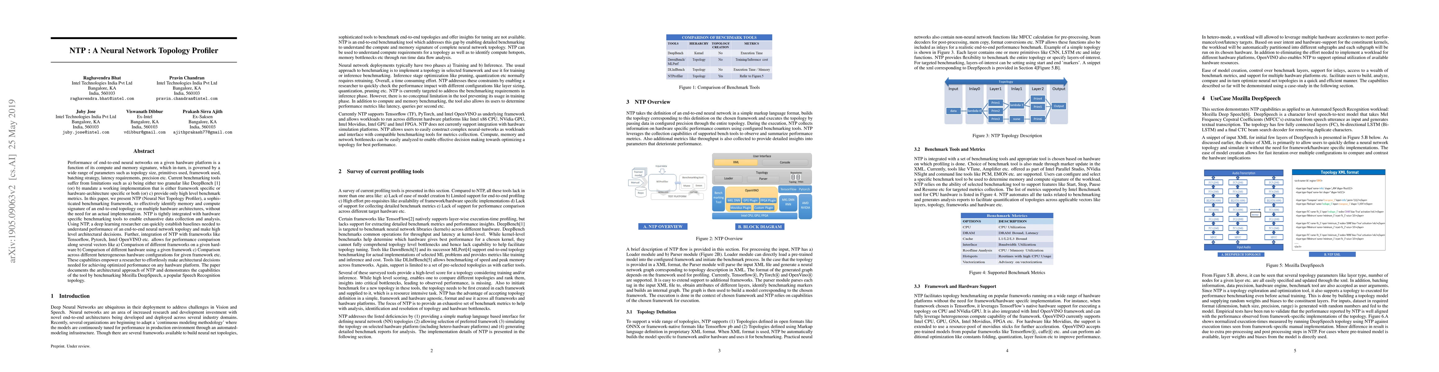 Performance of end-to-end neural networks on a given hardware platform is a function of its compute and memory signature, which in-turn, is governed by a wide range of parameters such as topology size, primitives used, framework used, batching strategy, latency requirements, precision etc. Current benchmarking tools suffer from limitations such as a) being either too granular like DeepBench [1] (or) b) mandate a working implementation that is either framework specific or hardware-architecture specific or both (or) c) provide only high level benchmark metrics. In this paper, we present NTP (Neural Net Topology Profiler), a sophisticated benchmarking framework, to effectively identify memory and compute signature of an end-to-end topology on multiple hardware architectures, without the need for an actual implementation. NTP is tightly integrated with hardware specific benchmarking tools to enable exhaustive data collection and analysis. Using NTP, a deep learning researcher can quickly establish baselines needed to understand performance of an end-to-end neural network topology and make high level architectural decisions. Further, integration of NTP with frameworks like Tensorflow, Pytorch, Intel OpenVINO etc. allows for performance comparison along several vectors like a) Comparison of different frameworks on a given hardware b) Comparison of different hardware using a given framework c) Comparison across different heterogeneous hardware configurations for given framework etc. These capabilities empower a researcher to effortlessly make architectural decisions needed for achieving optimized performance on any hardware platform. The paper documents the architectural approach of NTP and demonstrates the capabilities of the tool by benchmarking Mozilla DeepSpeech, a popular Speech Recognition topology.