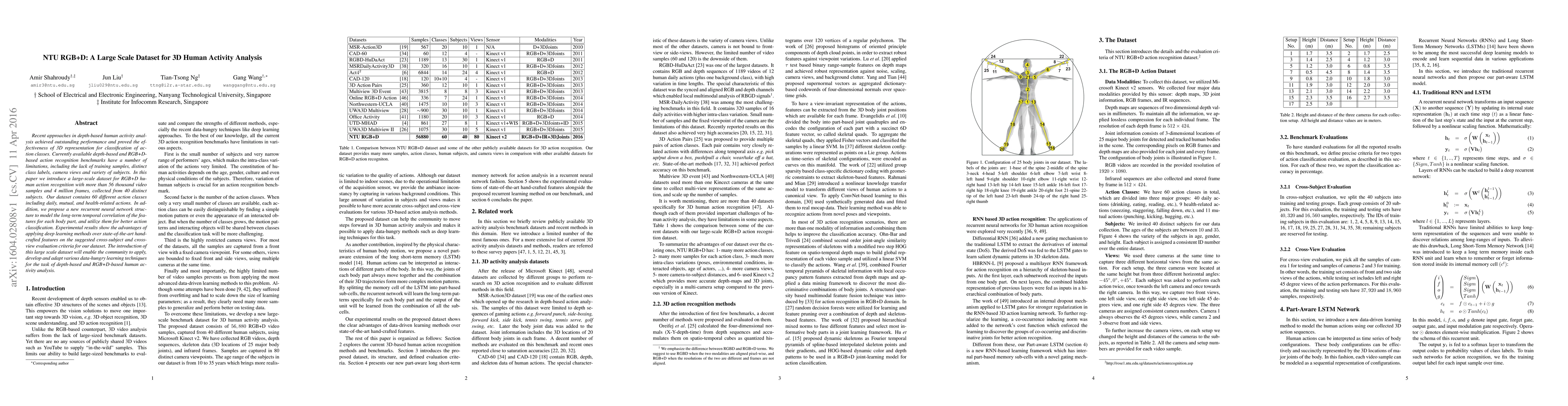 This paper introduces NTU RGB+D, a large-scale dataset for 3D human activity analysis with over 56,000 video samples and 4 million frames from 40 distinct subjects. The dataset includes 60 diverse action classes and proposes a new recurrent neural network to model temporal correlations, demonstrating superior performance of deep learning methods over traditional features.