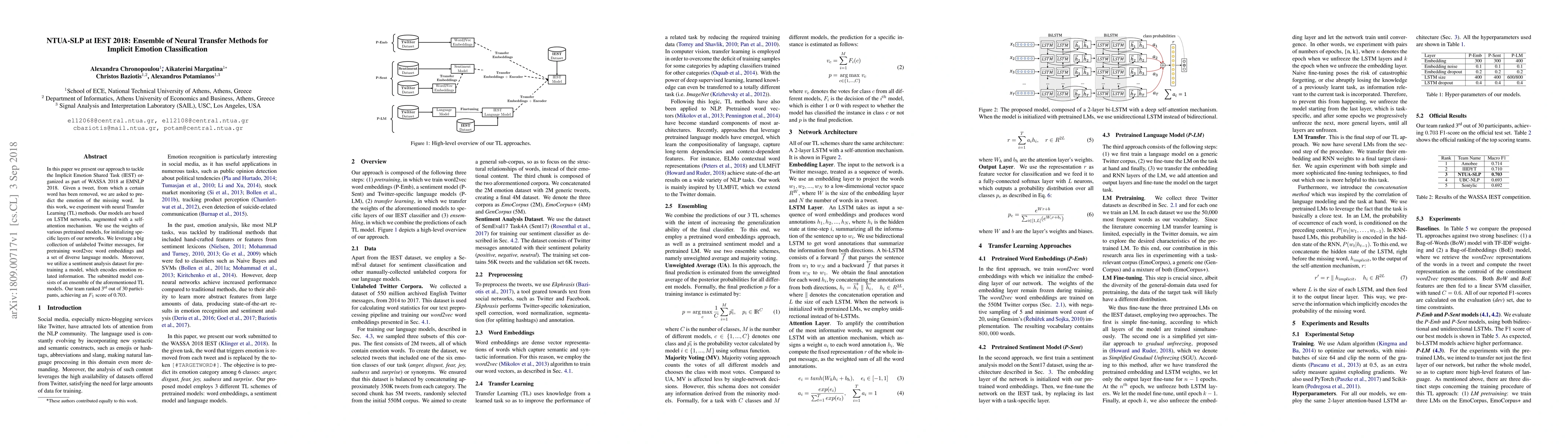 The NTUA-SLP team developed an ensemble of neural transfer learning methods, based on LSTM networks with self-attention, to predict the emotion of a missing word in a tweet, achieving a 3rd-place finish with an F1 score of 0.703 in the Implicit Emotion Shared Task at IEST 2018. The models utilized pretrained embeddings and language models, and performed well in classifying implicit emotions.