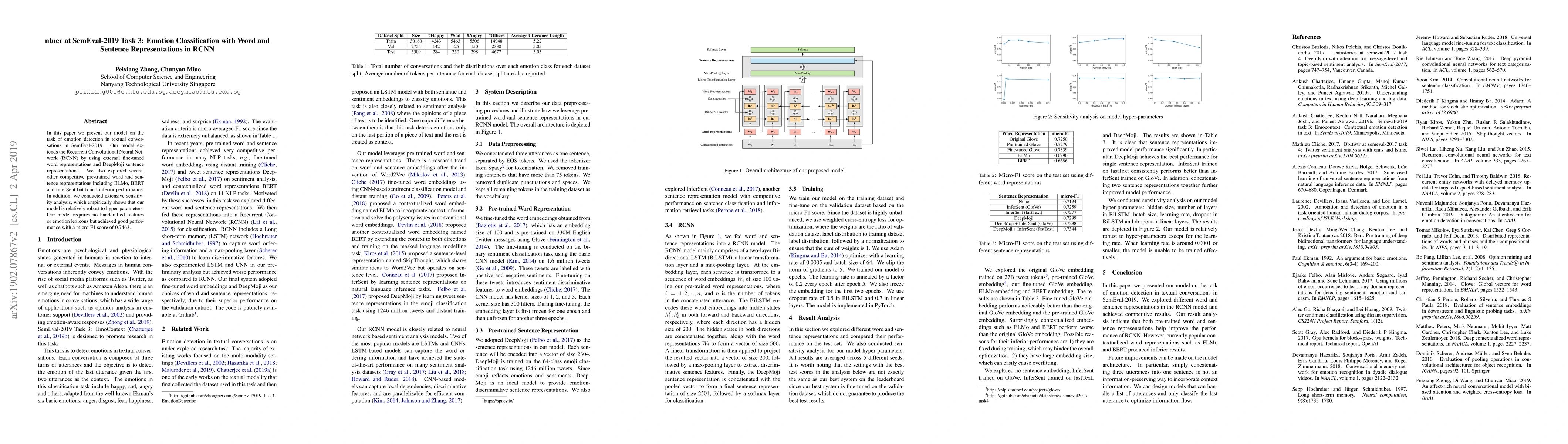 The paper describes a model for emotion detection in text using an extended RCNN with fine-tuned word and DeepMoji sentence representations, achieving a micro-F1 score of 0.7463. Despite exploring other pre-trained representations, the authors found them inferior and emphasized the robustness of their model.