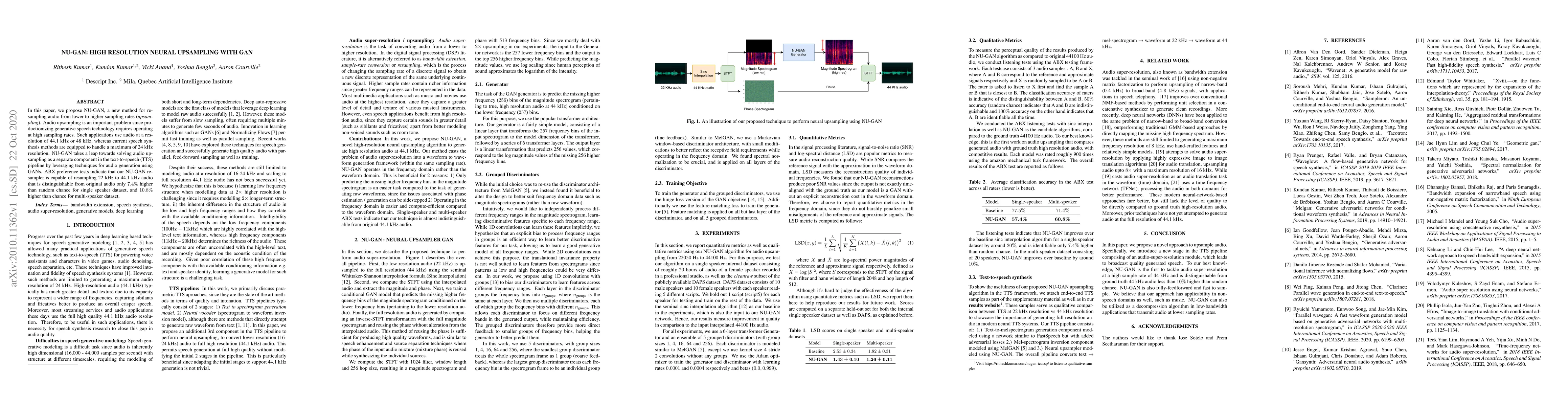 NU-GAN is a novel method for upsampling audio from lower to higher sampling rates, specifically designed to bridge the gap between current speech synthesis capabilities and higher resolution requirements in generative speech technology. The method leverages GAN techniques and shows promising results in ABX preference tests, indicating high fidelity in resampling 22 kHz audio to 44.1 kHz.