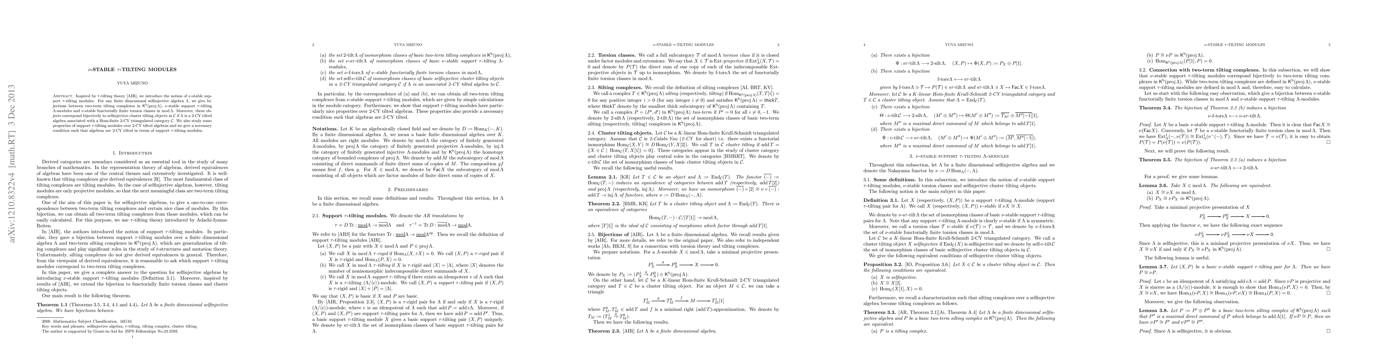 The paper introduces nu-stable support tau-tilting modules, establishing bijections between these modules and two-term tilting complexes, functorially finite torsion classes, and selfinjective cluster tilting objects in a 2-CY tilted algebra context. It provides a necessary condition for selfinjective algebras to be 2-CY tilted.