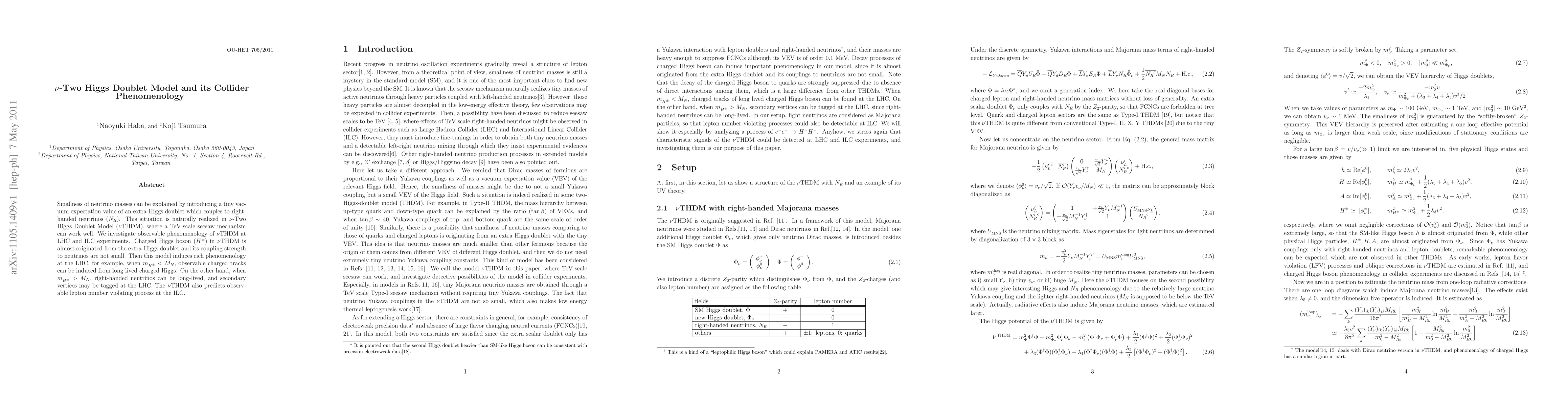 The $\nu$-Two Higgs Doublet Model explains small neutrino masses via an extra-Higgs doublet, leading to rich collider phenomenology at LHC and ILC, including long-lived charged Higgs and lepton number violating processes.