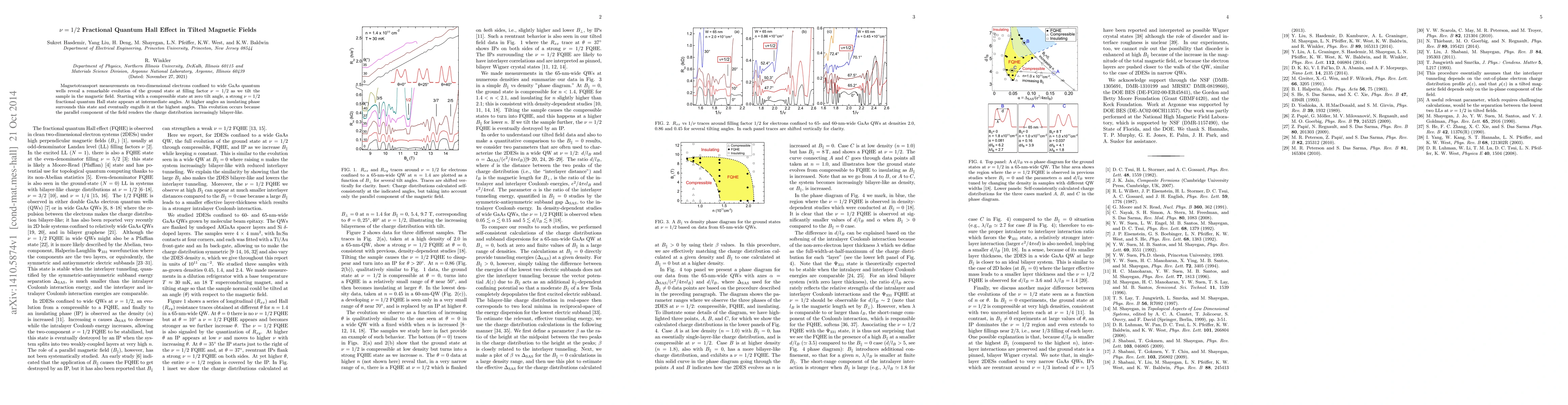 This study investigates the $\nu=1/2$ fractional quantum Hall effect in tilted magnetic fields, showing that the ground state transforms from compressible to a strong fractional quantum Hall state at intermediate angles, followed by an insulating phase at higher angles due to the parallel magnetic field's effect on the charge distribution.