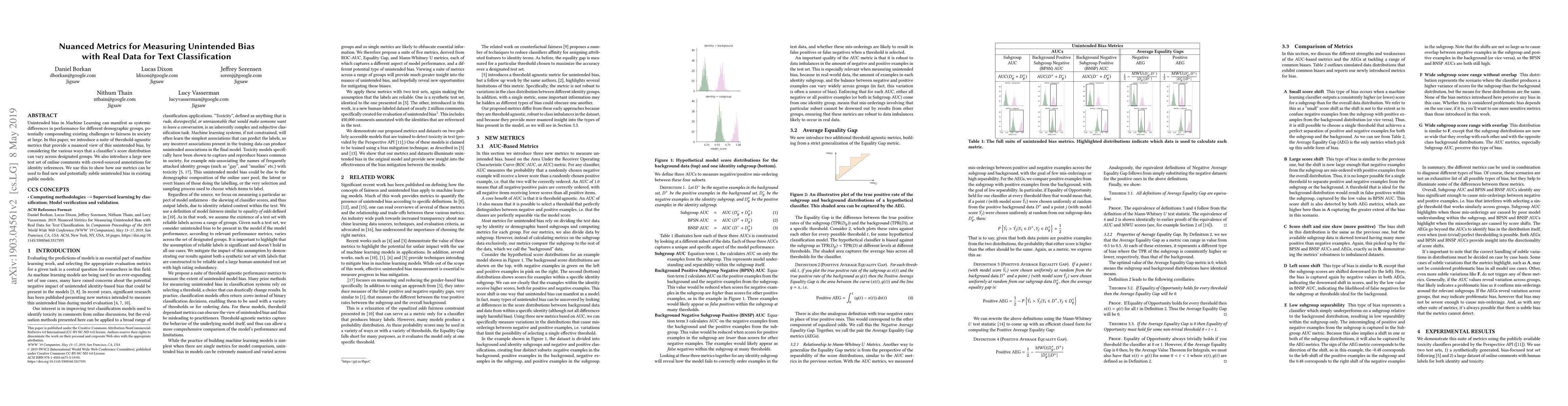 Unintended bias in Machine Learning can manifest as systemic differences in performance for different demographic groups, potentially compounding existing challenges to fairness in society at large. In this paper, we introduce a suite of threshold-agnostic metrics that provide a nuanced view of this unintended bias, by considering the various ways that a classifier's score distribution can vary across designated groups. We also introduce a large new test set of online comments with crowd-sourced annotations for identity references. We use this to show how our metrics can be used to find new and potentially subtle unintended bias in existing public models.
