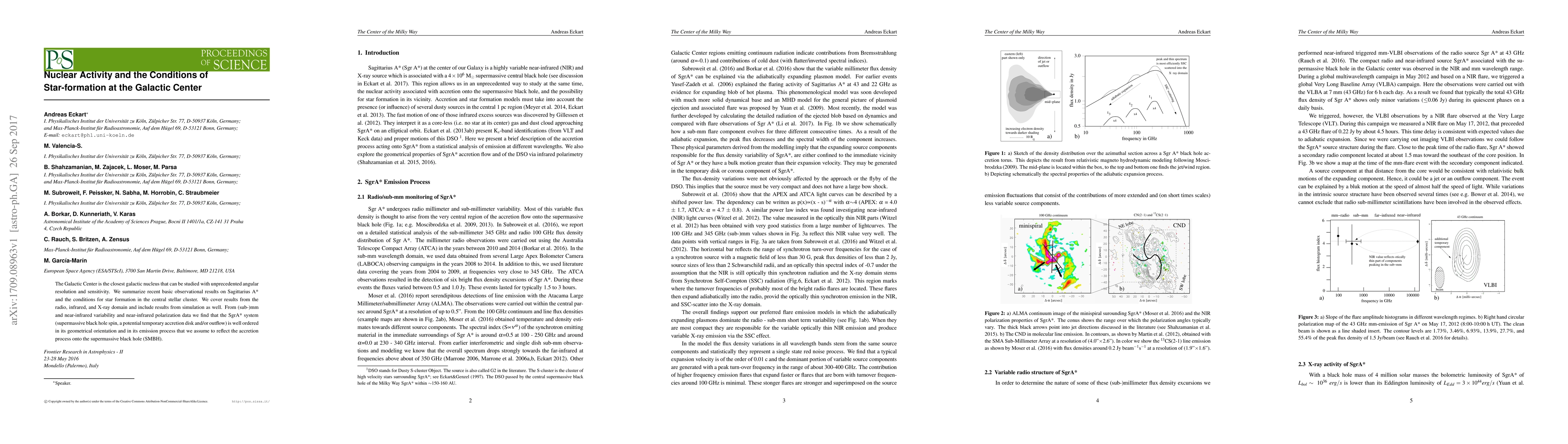The Galactic Center is the closest galactic nucleus that can be studied with unprecedented angular resolution and sensitivity. We summarize recent basic observational results on Sagittarius A* and the conditions for star formation in the central stellar cluster. We cover results from the radio, infrared, and X-ray domain and include results from simulation as well. From (sub-)mm and near-infrared variability and near-infrared polarization data we find that the SgrA* system (supermassive black hole spin, a potential temporary accretion disk and/or outflow) is well ordered in its geometrical orientation and in its emission process that we assume to reflect the accretion process onto the supermassive black hole (SMBH).