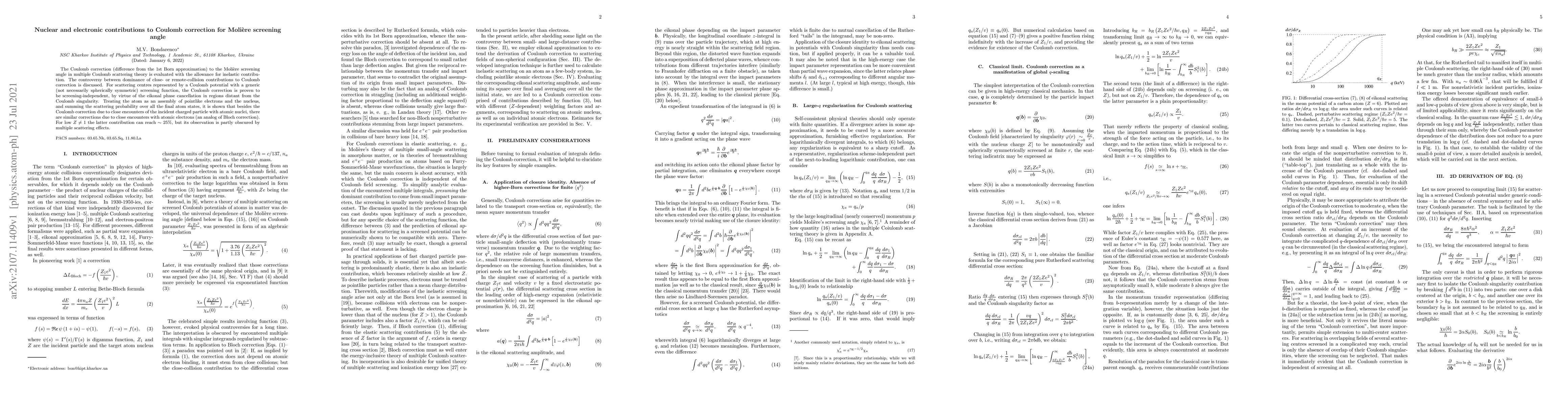 The Coulomb correction (difference from the 1st Born approximation) to the Moli\`{e}re screening angle in multiple Coulomb scattering theory is evaluated with the allowance for inelastic contribution. The controversy between dominance of close- or remote-collision contributions to Coulomb correction is discussed. For scattering centres represented by a Coulomb potential with a generic (not necessarily spherically symmetric) creening function, the Coulomb correction is proven to be screening-independent, by virtue of the eikonal phase cancellation in regions distant from the Coulomb singularity. Treating the atom %more self-consistently, as an assembly of pointlike electrons and the nucleus, and summing the scattering probability over all the final atom states, it is shown that besides the Coulomb correction due to close encounters of the incident charged particle with atomic nuclei, there are similar corrections due to close encounters with atomic electrons (an analog of Bloch correction). For low $Z\neq1$ the latter contribution can reach $\sim 25\%$, but its observation is partly obscured by multiple scattering effects.