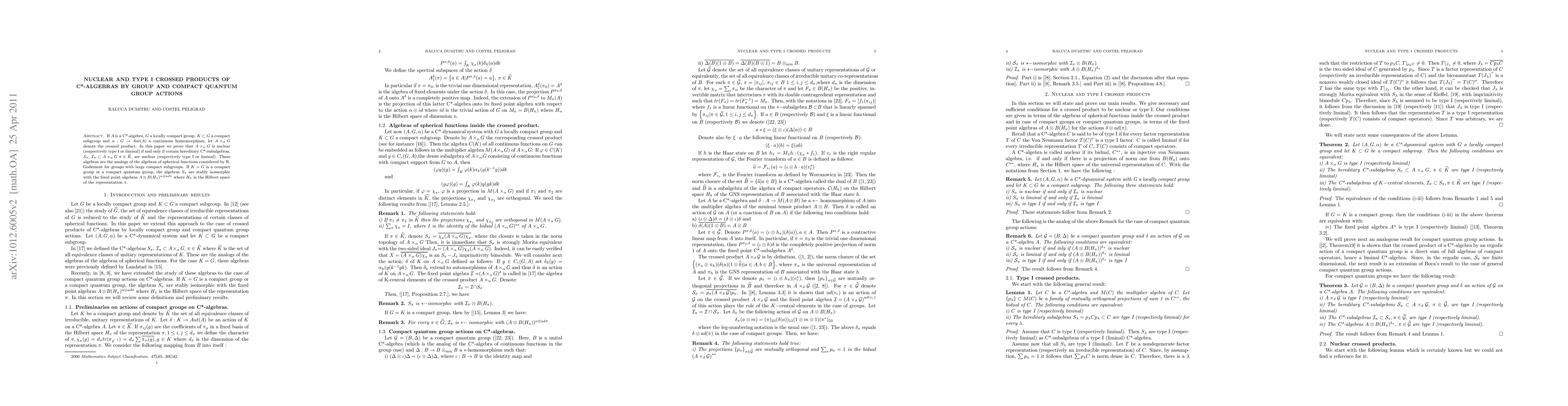If A is a C*-algebra, G a locally compact group, K{\subset}G a compact subgroup and {\alpha}:G{\to}Aut(A) a continuous homomorphism, let Ax_{{\alpha}}G denote the crossed product. In this paper we prove that Ax_{{\alpha}}G is nuclear (respectively type I or liminal) if and only if certain hereditary C*-subalgebras, S_{{\pi}}, I_{{\pi}}{\subset}Ax_{{\alpha}}G {\pi}{\in}K, are nuclear (respectively type I or liminal). These algebras are the analogs of the algebras of spherical functions considered by R. Godement for groups with large compact subgroups. If K=G is a compact group or a compact quantum group, the algebras S_{{\pi}} are stably isomorphic with the fixed point algebras A{\otimes}B(H_{{\pi}})^{{\alpha}{\otimes}ad{\pi}} where H_{{\pi}} is the Hilbert space of the representation {\pi}.