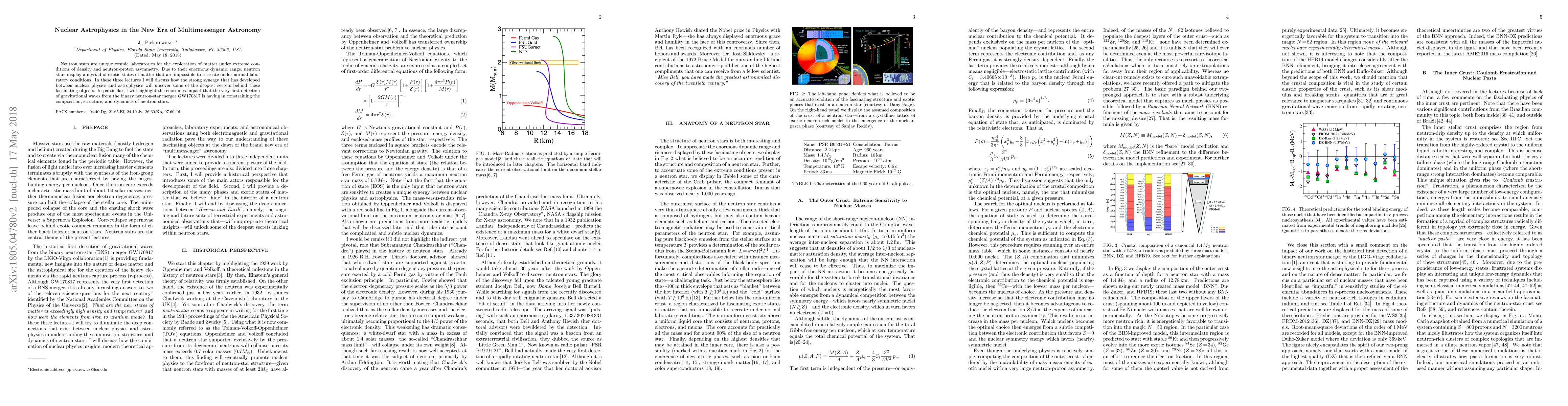 Neutron stars are unique cosmic laboratories for the exploration of matter under extreme conditions of density and neutron-proton asymmetry. Due to their enormous dynamic range, neutron stars display a myriad of exotic states of matter that are impossible to recreate under normal laboratory conditions. In these three lectures I will discuss how the strong synergy that has developed between nuclear physics and astrophysics will uncover some of the deepest secrets behind these fascinating objects. In particular, I will highlight the enormous impact that the very first detection of gravitational waves from the binary neutron-star merger GW170817 is having in constraining the composition, structure, and dynamics of neutron stars.