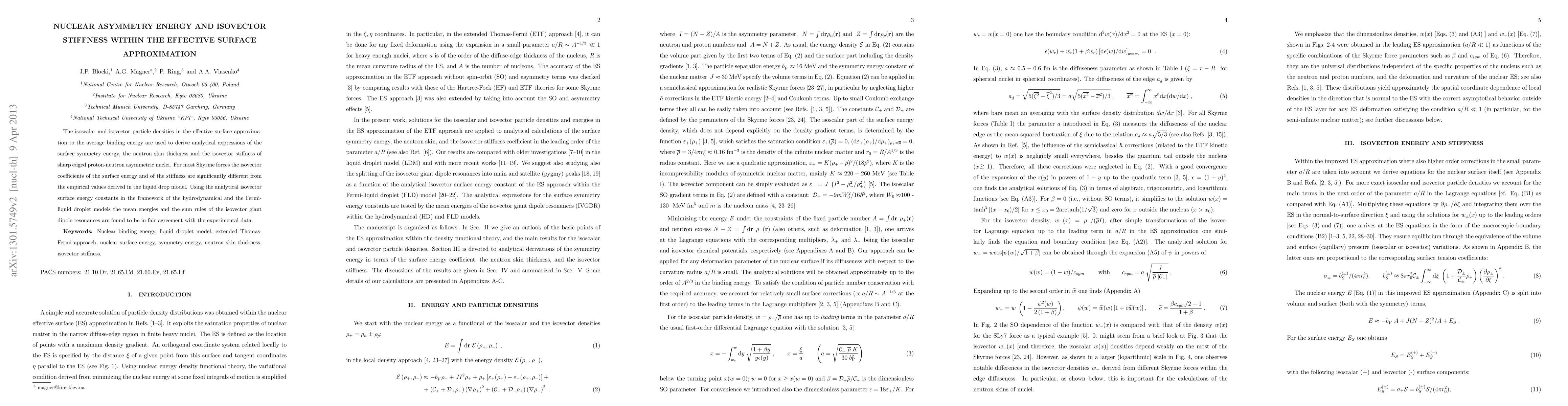 The isoscalar and isovector particle densities and the surface tension coefficients at the average binding energy are used to derive analytical expressions of the neutron skin thickness and the isovector stiffness of sharp edged proton-neutron asymmetric nuclei. For most Skyrme forces these quantities are significantly larger than the well known ones. Using the analytical isovector surface energy constants in the framework of the hydrodynamical and the Fermi-liquid droplet models the mean energies and the sum rules of the isovector giant dipole resonances are in fair agreement with the experimental data.