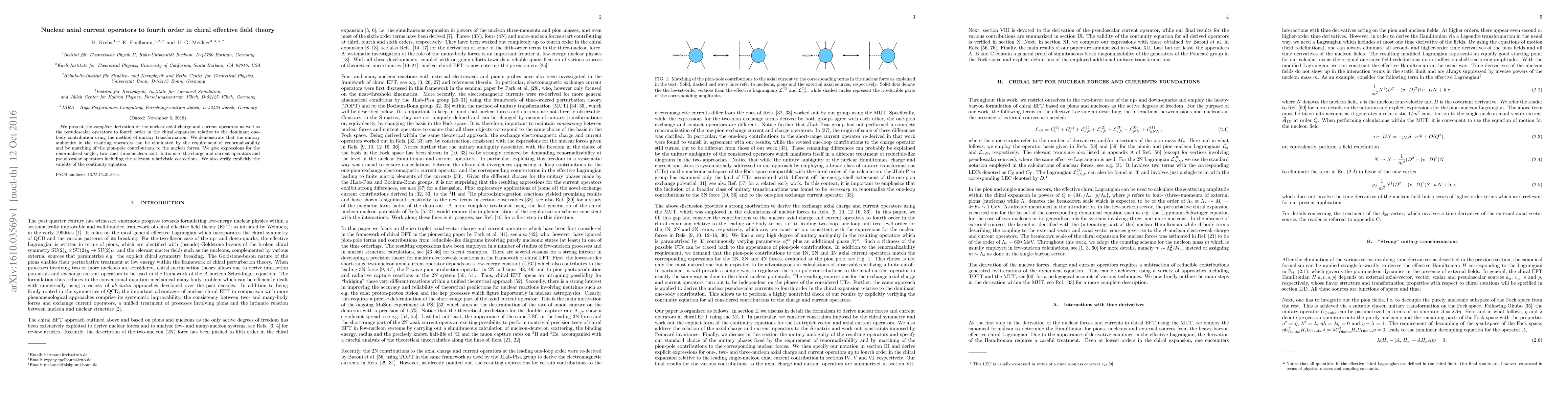 We present the complete derivation of the nuclear axial charge and current operators as well as the pseudoscalar operators to fourth order in the chiral expansion relative to the dominant one-body contribution using the method of unitary transformation. We demonstrate that the unitary ambiguity in the resulting operators can be eliminated by the requirement of renormalizability and by matching of the pion-pole contributions to the nuclear forces. We give expressions for the renormalized single-, two- and three-nucleon contributions to the charge and current operators and pseudoscalar operators including the relevant relativistic corrections. We also verify explicitly the validity of the continuity equation.