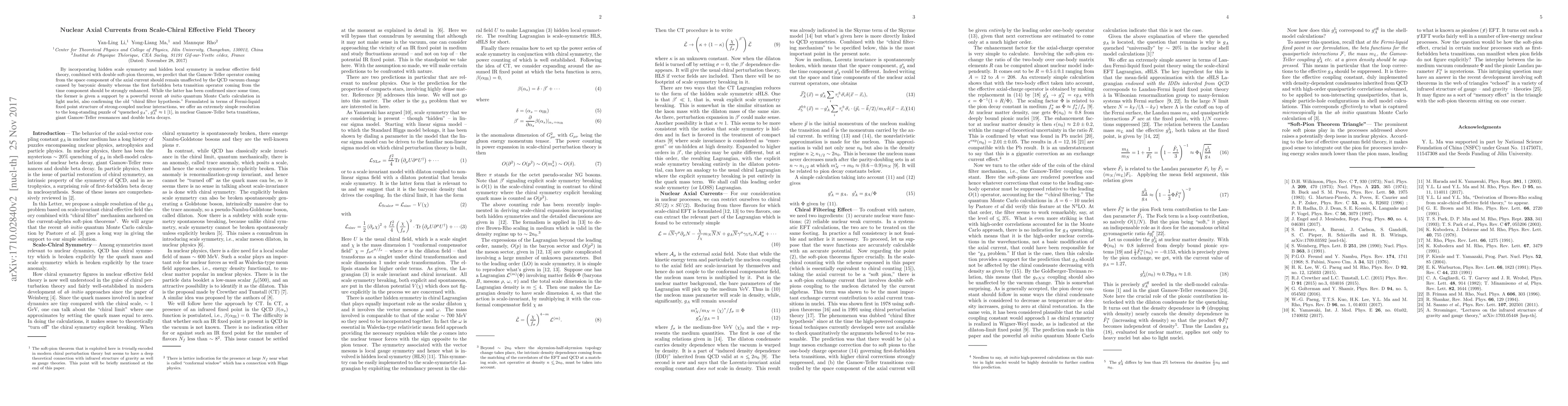 By incorporating hidden scale symmetry and hidden local symmetry in nuclear effective field theory, combined with double soft-pion theorem, we predict that the Gamow-Teller operator coming from the space component of the axial current should remain unaffected by the QCD vacuum change caused by baryonic density whereas the first forbidden beta transition operator coming from the time component should be strongly enhanced. While the latter has been confirmed since some time, the former is given a support by a powerful recent {\it ab initio} quantum Monte Carlo calculation in light nuclei, also confirming the old "chiral filter hypothesis." Formulated in terms of Fermi-liquid fixed point structure of strong-coupled nuclear interactions, we offer an extremely simple resolution to the long-standing puzzle of "quenched $g_A$", $g_A^{\rm eff}\approx 1$~\cite{quenched}, in nuclear Gamow-Teller beta transitions, giant Gamow-Teller resonances and double beta decays.