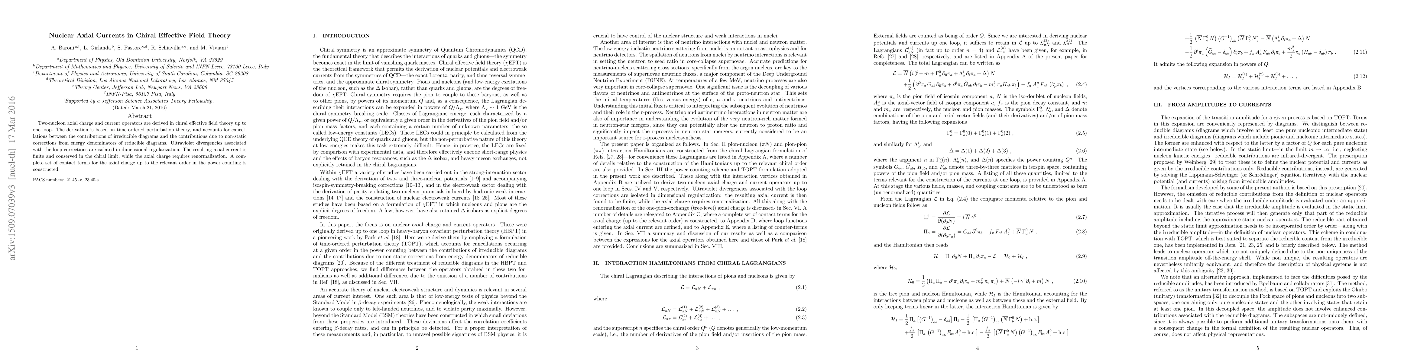 This paper derives two-nucleon axial charge and current operators in chiral effective field theory up to one loop, ensuring finiteness and conservation of the axial current while requiring renormalization of the axial charge, with a complete set of contact terms constructed.